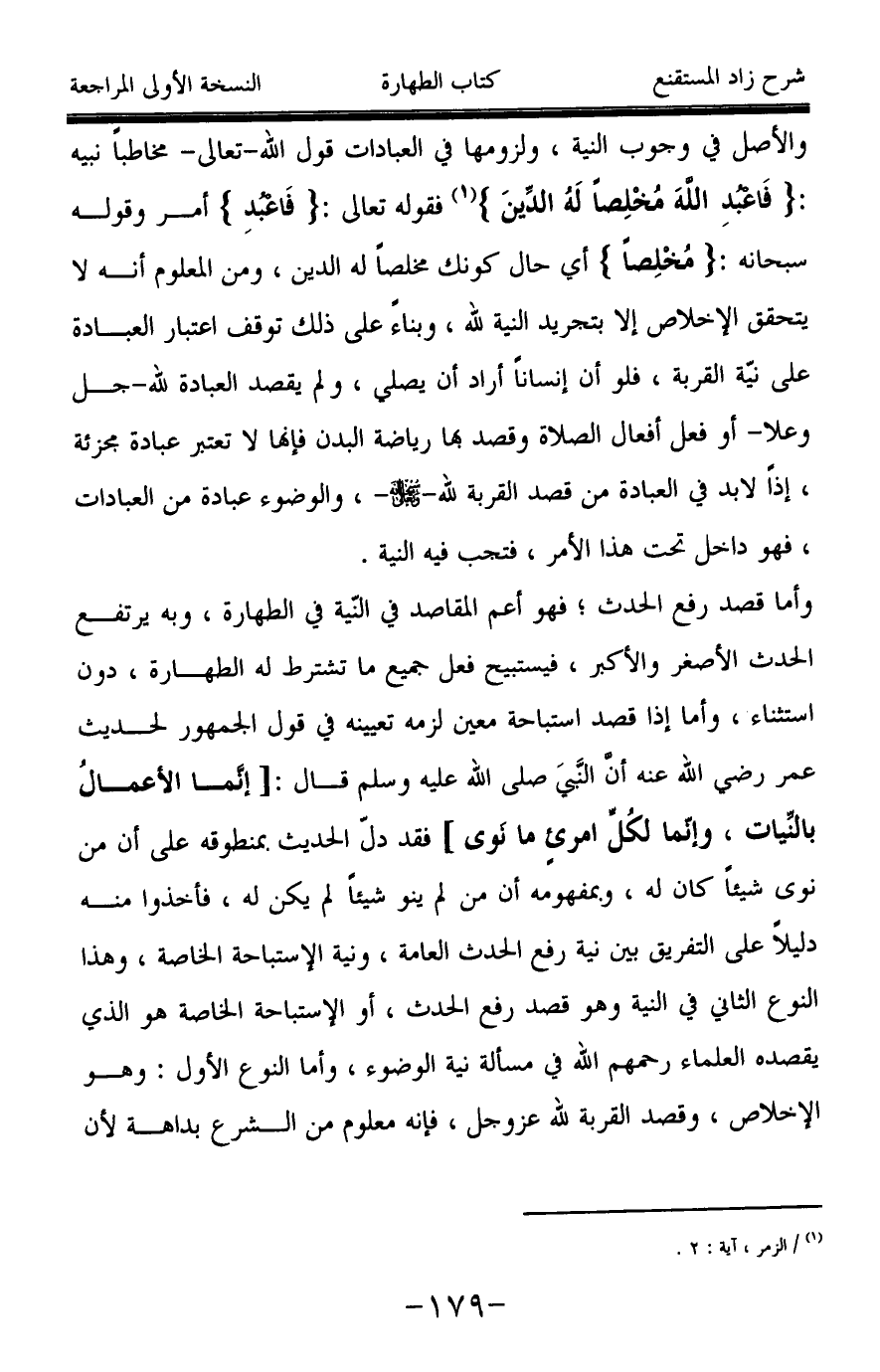 وأما قصد رفع الحدث؛ فهو أعم المقاصد في النية في الطهارة، وبه يرتفع الحدث الأصغر والأكبر، فيستبيح فعل جميع ما تشترط له الطهارة، دون استثناء، وأما إذا قصد استباحة معين لزمه تعيينه في قول الجمهور لحديث عمر رضي الله عنه أنَّ النبيَ صَلَّى اللَّهُ عَلَيْهِ وَسَلَّمَ قال: [إنما الأعمالُ بالنيات، وإنما لكُلِّ امرئٍ ما نوى] فقد دل الحديث بمنطوقه على أن من نوى شيئاً كان له، وبمفهومه أن من لم ينو شيئاً لم يكن له، فأخذوا منه دليلاً على التفريق بين نية رفع الحدث العامة، ونية الإستباحة الخاصة، وهذا النوع الثاني في النية وهو قصد رفع الحدث، أو الإستباحة الخاصة هو الذي يقصده العلماء رحمهم الله في مسألة نية الوضوء، وأما النوع الأول: وهو الإخلاص، وقصد القربة لله عز وجل، فإنه معلوم من الشرع بداهة لأن