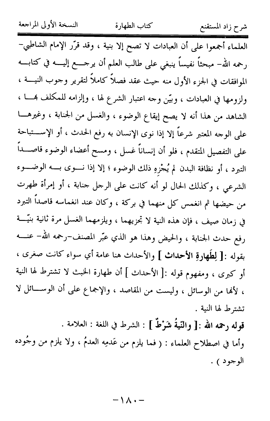 العلماء أجمعوا على أن العبادات لا تصح إلا بنية، وقد قرر الإمام الشاطبي -رحمه الله- مبحثاً نفيساً ينبغي على طالب العلم أن يرجع إليه في كتابه الموافقات في الجزء الأول منه حيث عقد فصلاً كاملاً لتقرير وجوب النية، ولزومها في العبادات، وبيّن وجه اعتبار الشرع لها، وإلزامه للمكلف بها، الشاهد من هذا أنه لا يصح إيقاع الوضوء، والغسل من الجنابة، وغيرها على الوجه المعتبر شرعاً إلا إذا نوى الإنسان به رفع الحدث، أو الإستباحة على التفصيل المتقدم، فلو أن إنساناً غسل، ومسح أعضاء الوضوء قاصداً التبرد، أو نظافة البدن لم يُجْزِهِ ذلك الوضوء؛ إلا إذا نوى به الوضوء الشرعي، وكذلك الحال لو أنه كانت على الرجل جنابة، أو إمرأة طهرت من حيضها ثم انغمس كل منهما في بركة، وكان عند انغماسه قاصداً التبرد في زمان صيف، فإن هذه النية لا تجزيهما، ويلزمهما الغسل مرة ثانية بنيّة رفع حدث الجنابة، والحيض وهذا هو الذي عبّر المصنف -رحمه الله- عنه بقوله: [لِطَهارةِ الأحداث] والأحداث هنا عامة أي سواء كانت صغرى، أو كبرى، ومفهوم قوله: [الأحداث] أن طهارة الخبث لا تشترط لها النية، لأنها من الوسائل، وليست من المقاصد، والإجماع على أن الوسائل لا تشترط لها النية.