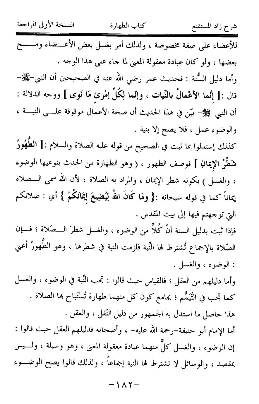 فإذا ثبت بدليل السنة أنّ كُلاًّ من الوضوء، والغسل شطرَ الصّلاة؛ فإن الصّلاة بالإجماع تُشترط لها النِّية فلزمت النية في شطرها، وهو الطُّهورُ أعني: الوضوء، والغسل.