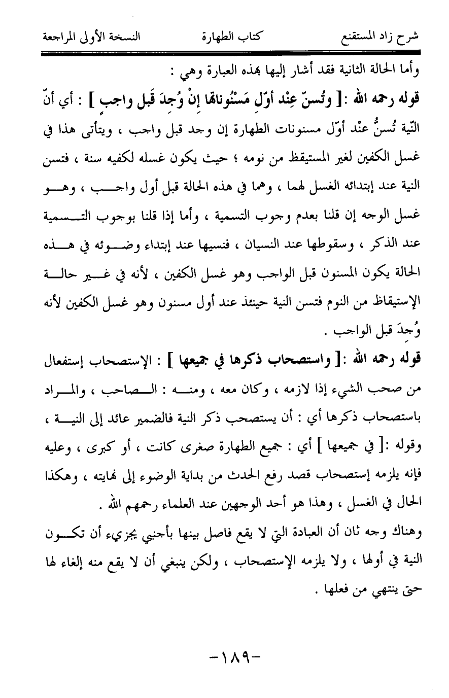 قوله رحمه الله: [واستصحاب ذكرها في جميعها]: الإستصحاب إستفعال من صحب الشيء إذا لازمه، وكان معه، ومنه: الصاحب، والمراد باستصحاب ذكرها أي: أن يستصحب ذكر النية فالضمير عائد إلى النية، وقوله: [في جميعها] أي: جميع الطهارة صغرى كانت، أو كبرى، وعليه فإنه يلزمه إستصحاب قصد رفع الحدث من بداية الوضوء إلى نهايته، وهكذا الحال في الغسل، وهذا هو أحد الوجهين عند العلماء رحمهم الله.