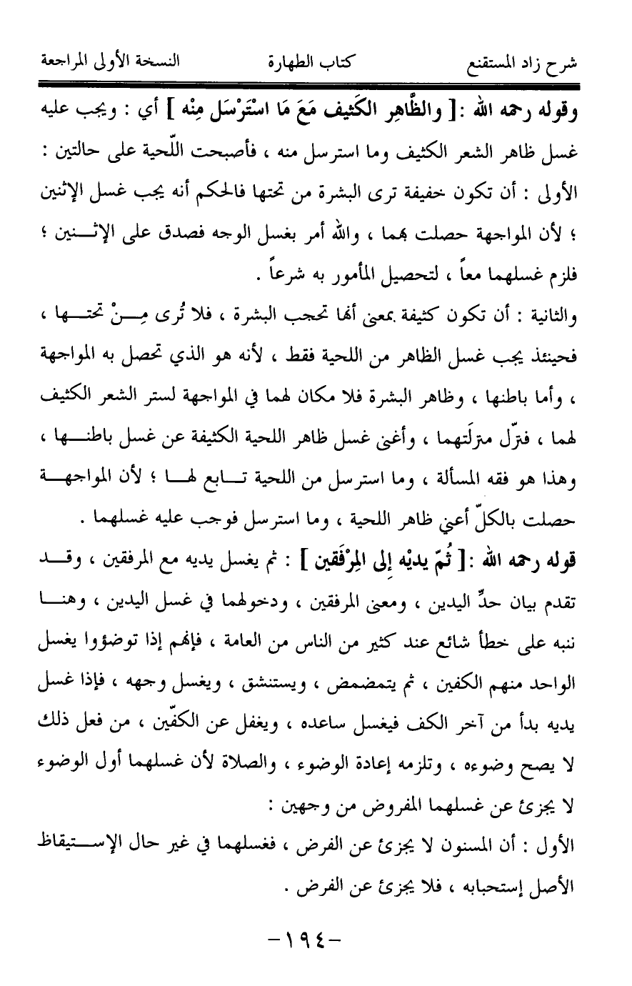 والثانية: أن تكون كثيفة بمعنى أنها تحجب البشرة، فلا تُّرى مِنْ تحتها، فحينئذ يجب غسل الظاهر من اللحية فقط، لأنه هو الذي تحصل به المواجهة، وأما باطنها، وظاهر البشرة فلا مكان لهما في المواجهة لستر الشعر الكثيف لهما، فنزّل منزلَتهما، وأغنى غسل ظاهر اللحية الكثيفة عن غسل باطنها، وهذا هو فقه المسألة، وما استرسل من اللحية تابع لها؛ لأن المواجهة حصلت بالكلّ أعنى ظاهر اللحية، وما استرسل فوجب عليه غسلهما.