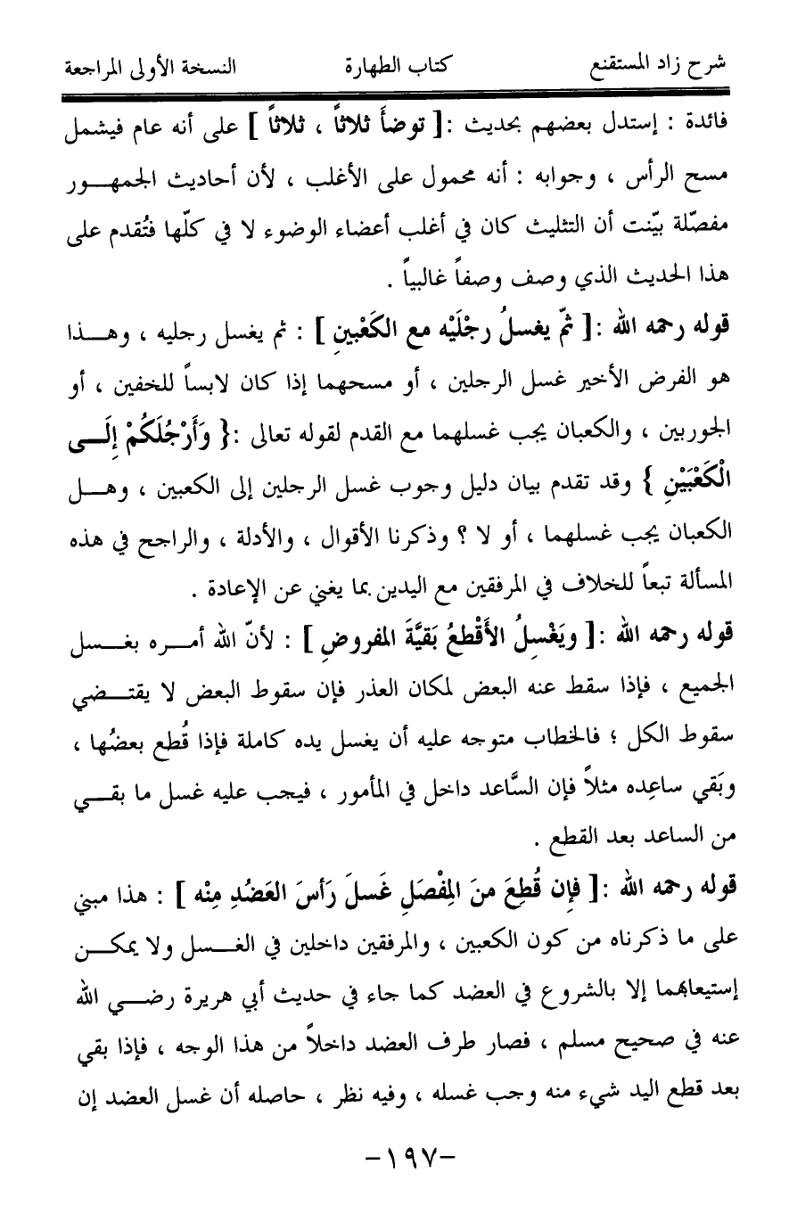 فائدة: إستدل بعضهم بحديث: [توضأَ ثلاثاً، ثلاثاً] على أنه عام فيشمل مسح الرأس، وجوابه: أنه محمول على الأغلب، لأن أحاديث الجمهور مفصّلة بيّنت أن التثليث كان في أغلب أعضاء الوضوء لا في كلّها فتُقدم على هذا الحديث الذي وصف وصفاً غالبياً.