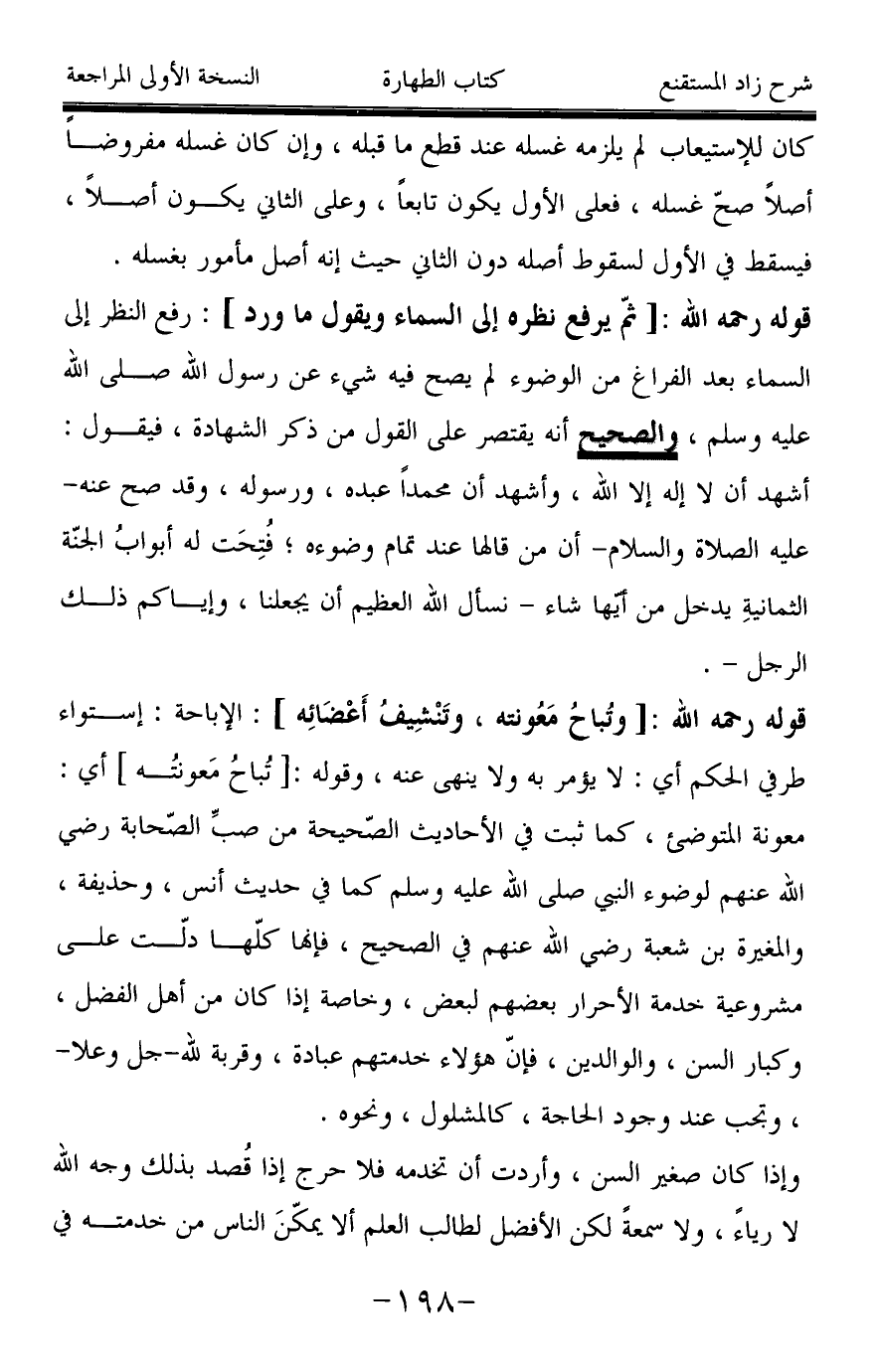 قوله رحمه الله: [ثمّ يرفع نظره إلى السماء ويقول ما ورد]: رفع النظر إلى السماء بعد الفراغ من الوضوء لم يصح فيه شيء عن رسول الله صَلَّى اللَّهُ عَلَيْهِ وَسَلَّمَ، والصحيح أنه يقتصر على القول من ذكر الشهادة، فيقول: أشهد أن لا إله إلا الله، وأشهد أن محمداً عبده، ورسوله، وقد صح عنه -عليه الصلاة والسلام- أن من قالها عند تمام وضوءه، فُتِحَت له أبوابُ الجنّة الثمانيةِ يدخل من أيها شاء -نسأل الله العظيم أن يجعلنا، وإياكم ذلك الرجل-.