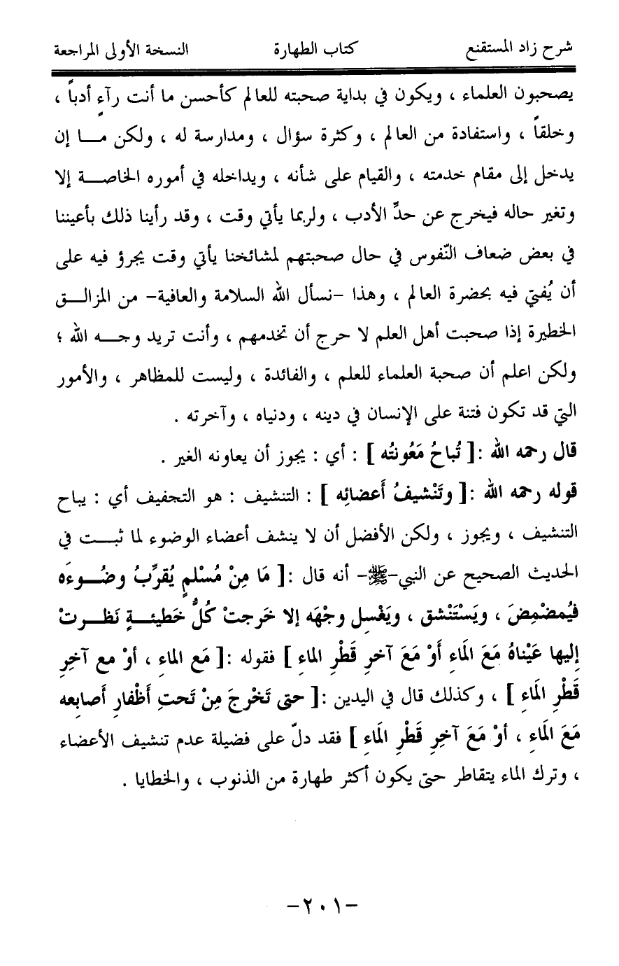 قوله رحمه الله: [وتَنْشيفُ أَعضائه]: التنشيف: هو التجفيف أي: يباح التنشيف، ويجوز، ولكن الأفضل أن لا ينشف أعضاء الوضوء لما ثبت في الحديث الصحيح عن النبي -صَلَّى اللَّهُ عَلَيْهِ وَسَلَّمَ- أنه قال: [مَا مِنْ مُسْلم يُقرِّبُ وضُوءَه فيُمضمِضَ، ويَسْتَنْشق، ويَغسِل وجْهَه إلا خَرجتْ كُلُّ خَطيئةٍ نَظرتْ إِليها عَيْناهُ مَعَ المَاءِ أَوْ مَعَ آخرِ قَطْرِ الماءِ] فقوله: [مَع الماءِ، أوْ مع آخِرِ قَطْرِ المَاءِ]، وكذلك قال في اليدين: [حتى تَخْرجَ مِنْ تَحتِ أَظْفارِ أَصابِعه مَعَ الماءِ، أوْ مَعَ آخِرِ قَطْرِ الماء] فقد دلّ على فضيلة عدم تنشيف الأعضاء، وترك الماء يتقاطر حتى يكون أكثر طهارة من الذنوب، والخطايا.