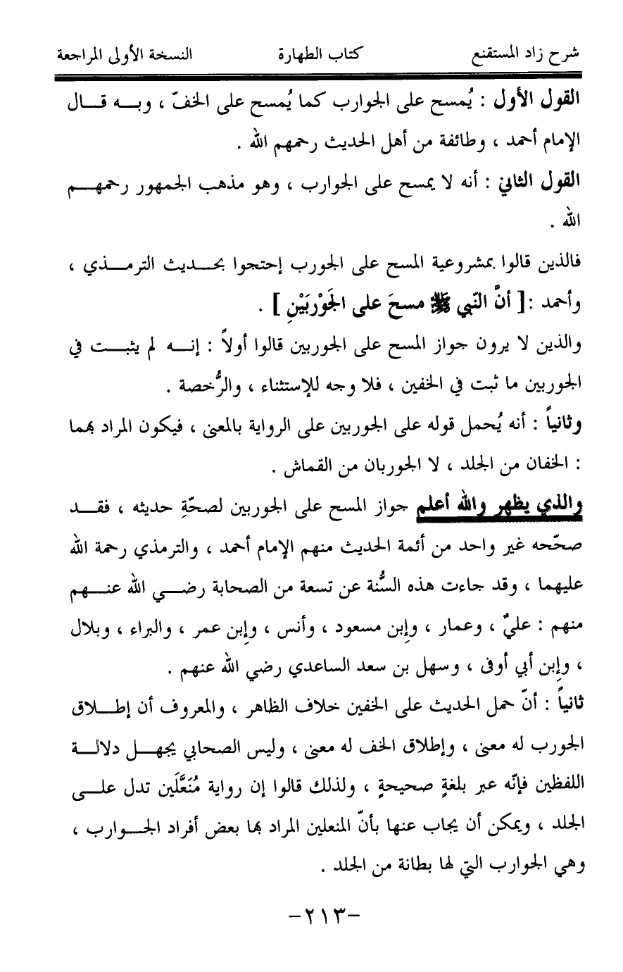والذي يظهر والله أعلم جواز المسح على الجوربين لصحّةِ حديثه، فقد صحّحه غير واحد من أئمة الحديث منهم الإمام أحمد، والترمذي رحمة الله عليهما، وقد جاءت هذه السُّنة عن تسعة من الصحابة رضي الله عنهم منهم: عليٌ، وعمار، وإِبن مسعود، وأنس، وإِبن عمر، والبراء، وبلال، وإبن أبي أوفى، وسهل بن سعد الساعدي رضي الله عنهم.