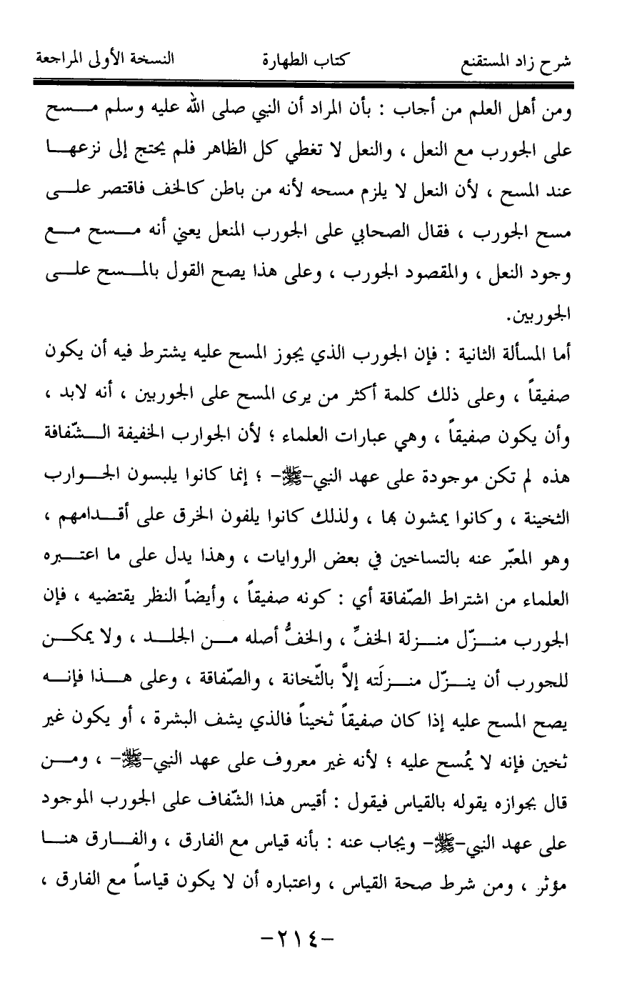 أما المسألة الثانية: فإن الجورب الذي يجوز المسح عليه يشترط فيه أن يكون صفيقاً، وعلى ذلك كلمة أكثر من يرى المسح على الجوربين، أنه لا بد، وأن يكون صفيقاً، وهي عبارات العلماء، لأن الجوارب الخفيفة الشّفافة هذه لم تكن موجودة على عهد النبي -صَلَّى اللَّهُ عَلَيْهِ وَسَلَّمَ-؛ إنما كانوا يلبسون الجوارب الثخينة، وكانوا يمشون بها، ولذلك كانوا يلفون الخرق على أقدامهم، وهو المعبّر عنه بالتساخين في بعض الروايات، وهذا يدل على ما اعتبره العلماء من اشتراط الصّفاقة أي: كونه صفيقاً، وأيضاً النظر يقتضيه، فإن الجورب منزّل منزلة الخفِّ، والخفُّ أصله من الجلد، ولا يمكن للجورب أن ينزّل منزلَته إلا بالثّخانة، والصّفاقة، وعلى هذا فإنه يصح المسح عليه إذا كان صفيقاً ثخيناً فالذي يشف البشرة، أو يكون غير ثخين فإنه لا يمُسح عليه؛ لأنه غير معروف على عهد النبي -صَلَّى اللَّهُ عَلَيْهِ وَسَلَّمَ-، ومن قال بجوازه يقوله بالقياس فيقول: أقيس هذا الشّفاف على الجورب الموجود على عهد النبي -صَلَّى اللَّهُ عَلَيْهِ وَسَلَّمَ- ويجاب عنه: بأنه قياس مع الفارق، والفارق هنا مؤثر، ومن شرط صحة القياس، واعتباره أن لا يكون قياساً مع الفارق،