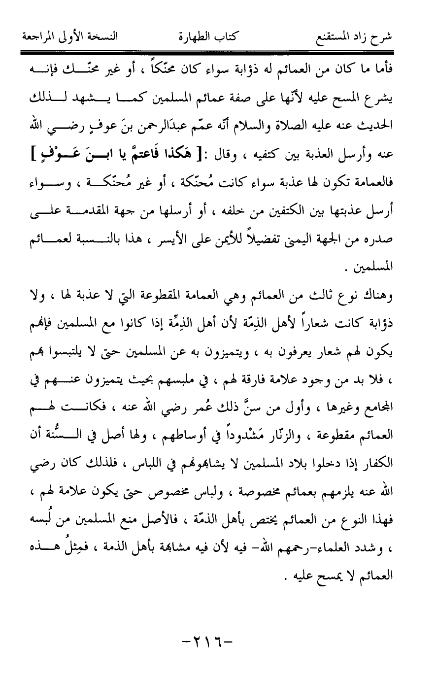 فأما ما كان من العمائم له ذؤابة سواء كان محنّكاً، أو غير محنّك فإنه يشرع المسح عليه لأنها على صفة عمائم المسلمين كما يشهد لذلك الحديث عنه عليه الصلاة والسلام أنه عمّم عبدَ الرحمن بنَ عوفٍ رضي الله عنه وأرسل العذبة بين كتفيه، وقال: [هَكذا فَاعتمَّ يا ابنَ عَوْفٍ] فالعمامة تكون لها عذبة سواء كانت مُحنّكة، أو غير مُحنّكة، وسواء أرسل عذبتها بين الكتفين من خلفه، أو أرسلها من جهة المقدمة على صدره من الجهة اليمنى تفضيلاً للأيمن على الأيسر، هذا بالنسبة لعمائم المسلمين.