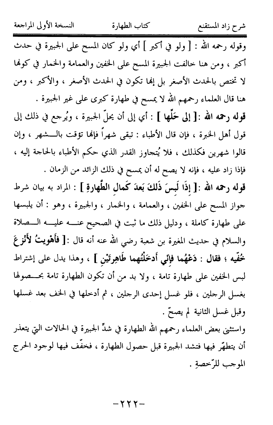 قوله رحمه الله: [إِذَا لَبِسَ ذَلكَ بَعدَ كمالِ الطهارةِ]: المراد به بيان شرط جواز المسح على الخفين، والعمامة، والخمار، والجبيرة، وهو: أن يلبسها على طهارة كاملة، ودليل ذلك ما ثبت في الصحيح عنه عليه الصلاة والسلام في حديث المغيرة بن شعبة رضي الله عنه أنه قال: [فأَهْويتُ لأَنزعَ خُفّيه؛ فقال: دَعْهُما فإني أَدخَلْتُهما طَاهِرتَيْنِ]، وهذا يدل على إشتراط لبس الخفين على طهارة تامة، ولا بد من أن تكون الطهارة تامة بحصولها بغسل الرجلين، فلو غسل إحدى الرجلين، ثم أدخلها في الخف بعد غسلها وقبل غسل الثانية لم يصحّ.