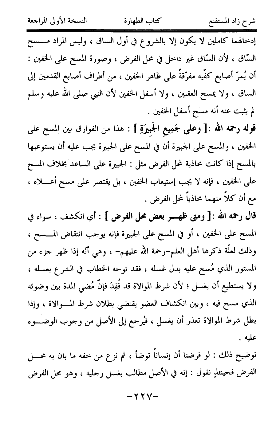 قوله رحمه الله: [وعلى جَميع الجَبِيرَةِ]: هذا من الفوارق بين المسح على الخفين، والمسح على الجبيرة أن في المسح على الجبيرة يجب عليه أن يستوعبها بالمسح إذا كانت محاذية لمحل الفرض مثل: الجبيرة على الساعد بخلاف المسح على الخفين، فإنه لا يجب إستيعاب الخفين، بل يقتصر على مسح أعلاه، مع أن كلاً منهما محاذياً لمحل الفرض.