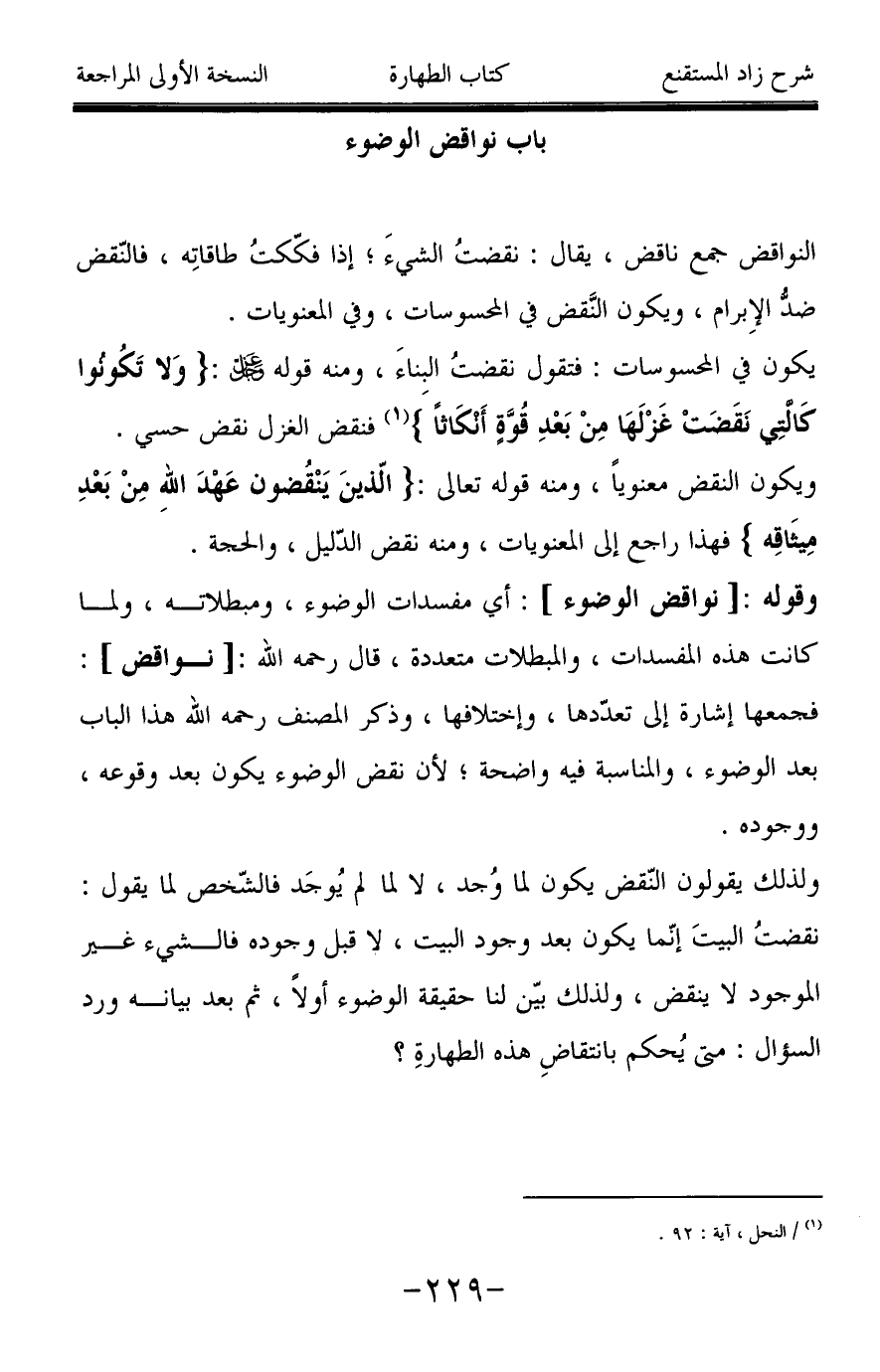 ولذلك يقولون النّقض يكون لما وُجد، لا لما لم يُوجَد فالشّخص لما يقول: نقضتُ البيتَ إنّما يكون بعد وجود البيت، لا قبل وجوده فالشيء غير الموجود لا ينقض، ولذلك بيّن لنا حقيقة الوضوء أولاً، ثم بعد بيانه ورد السؤال: متى يُحكم بانتقاضِ هذه الطهارةِ؟