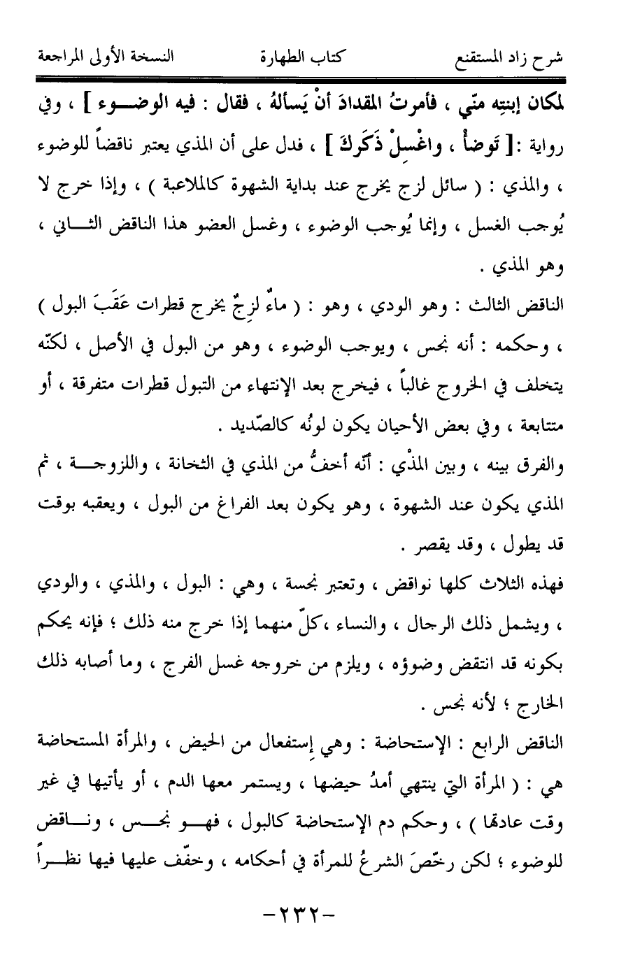 لمكان إبنتِه منّي، فأمرتُ المقدادَ أنْ يَسألهُ، فقال: فيه الوضوء]، وفي رواية: [تَوضأ، واغْسِلْ ذَكَركَ]، فدل على أن المذي يعتبر ناقضاً للوضوء، والمذي: (سائل لزج يخرج عند بداية الشهوة كالملاعبة)، وإذا خرج لا يُوجب الغسل، وإنما يُوجب الوضوء، وغسل العضو هذا الناقض الثاني، وهو المذي.