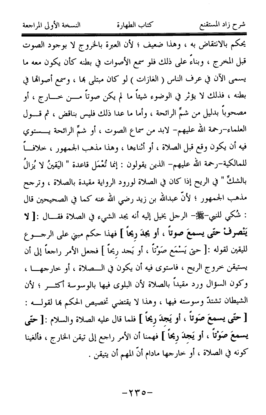 يحكم بالانتقاض به، وهذا ضعيف؛ لأن العبرة بالخروج لا بوجود الصوت قبل المخرج، وبناءً على ذلك فلو سمع الأصوات في بطنه كأن يكون معه ما يسمى الآن في عرف الناس (الغازات) لو كان مبتلى بها، وسمع أصواتها في بطنه، فذلك لا يؤثر في الوضوء شيئاً ما لم يكن صوتاً من خارج، أو مصحوباً بدليل من شمِّ الرائحة، وأما ما عدا ذلك فليس بناقض، ثم قول العلماء -رحمة الله عليهم- لا بد من سماع الصوت، أو شمِّ الرائحة يستوي فيه أن يكون وقع قبل الصلاة، أو أثناءها، وهذا مذهب الجمهور، خلافاً للمالكية -رحمة الله عليهم- الذين يقولون: إنما تُعْمَل قاعدة " اليَقينُ لا يُزالُ بالشكِّ " في الريح إذا كان في الصلاة لورود الرواية مقيدة بالصلاة، وترجح مذهب الجمهور؛ لأنّ عبد الله بن زيد رضي الله عنه كما في الصحيحين قال: شُكي للنبي -صَلَّى اللَّهُ عَلَيْهِ وَسَلَّمَ- الرجل يخيل إليه أنه يجد الشيء في الصلاة فقال: [لا يَنْصرفْ حتّى يسمعَ صوتاً، أو يجدَ رِيحاً] فهذا حكم مبني على الرجوع لليقين لقوله: [حتى يَسْمَع صَوْتاً، أو يَجد رِيحاً] فجعل الأمر راجعاً إلى أن يستيقن خروج الريح، فاستوى فيه أن يكون في الصلاة، أو خارجها، وكون السؤال ورد مقيداً بالصلاة لأن البلوى فيها بالوسوسة أكثر؛ لأن الشيطان تشتدّ وسوسته فيها، وهذا لا يقتضي تخصيص الحكم بها لقوله: [حتّى يسمعَ صَوتاً، أو يَجِدَ رِيحاً] فلما قال عليه الصلاة والسلام: [حتّى يسمعَ صَوْتاً، أو يَجِدَ رِيحاً] فهمنا أن الأمر راجع إلى تيقن الخارج، فألغينا كونه في الصلاة، أو خارجها ما دام أنّ المهم أن يتيقن.