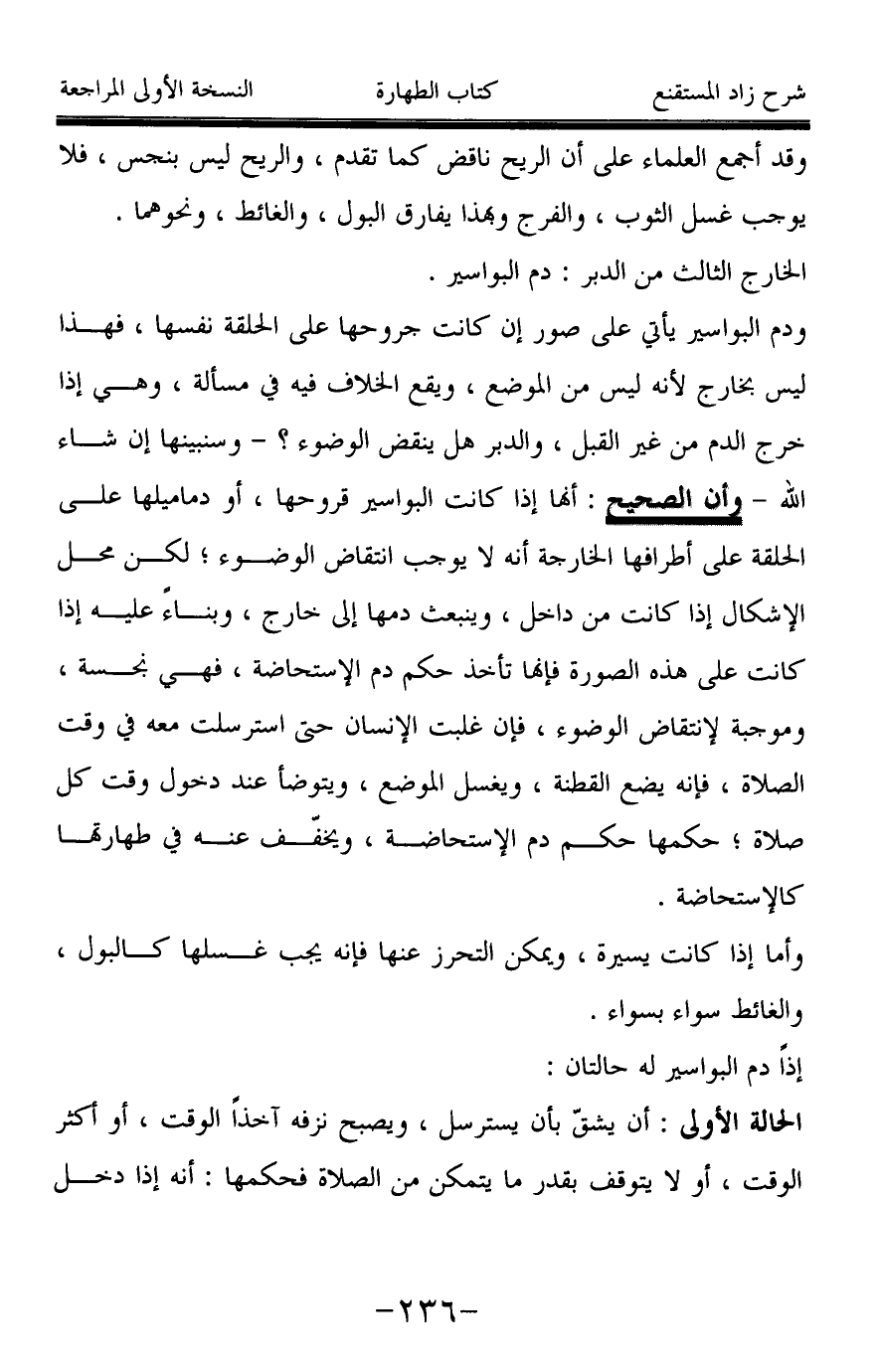 ودم البواسير يأتي على صور إن كانت جروحها على الحلقة نفسها، فهذا ليس بخارج لأنه ليس من الموضع، ويقع الخلاف فيه في مسألة، وهي إذا خرج الدم من غير القبل، والدبر هل ينقض الوضوء؟ -وسنبينها إن شاء الله- وأن الصحيح: أنها إذا كانت البواسير قروحها، أو دماميلها على الحلقة على أطرافها الخارجة أنه لا يوجب انتقاض الوضوء؛ لكن محل الإشكال إذا كانت من داخل، وينبعث دمها إلى خارج، وبناءً عليه إذا كانت على هذه الصورة فإنها تأخذ حكم دم الإستحاضة، فهي نجسة، وموجبة لإنتقاض الوضوء، فإن غلبت الإنسان حتى استرسلت معه في وقت الصلاة، فإنه يضع القطنة، ويغسل الموضع، ويتوضأ عند دخول وقت كل صلاة، حكمها حكم دم الإستحاضة، ويخفّف عنه في طهارتها كالإستحاضة.