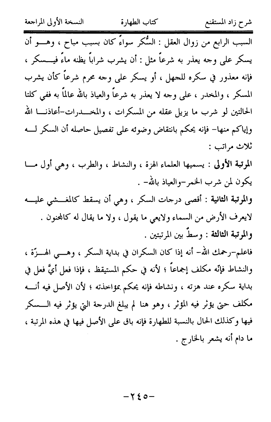 والمرتبة الثانية: أقصى درجات السكر، وهي أن يسقط كالمغشي عليه لا يعرف الأرض من السماء ولا يعي ما يقول، ولا ما يقال له كالمجنون.