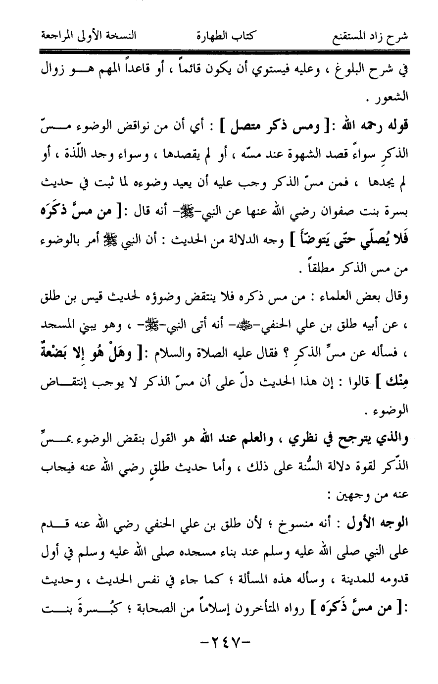 وقال بعض العلماء: من مس ذكره فلا ينتقض وضوؤه لحديث قيس بن طلق، عن أبيه طلق بن علي الحنفي -رضي الله عنه- أنه أتى النبي -صَلَّى اللَّهُ عَلَيْهِ وَسَلَّمَ-، وهو يبني المسجد، فسأله عن مسِّ الذكرِ؟ فقال عليه الصلاة والسلام: [وهَلْ هُو إِلا بضعةٌ مِنْك]. قالوا: إن هذا الحديث دلّ على أن مسّ الذكر لا يوجب إنتقاض الوضوء.