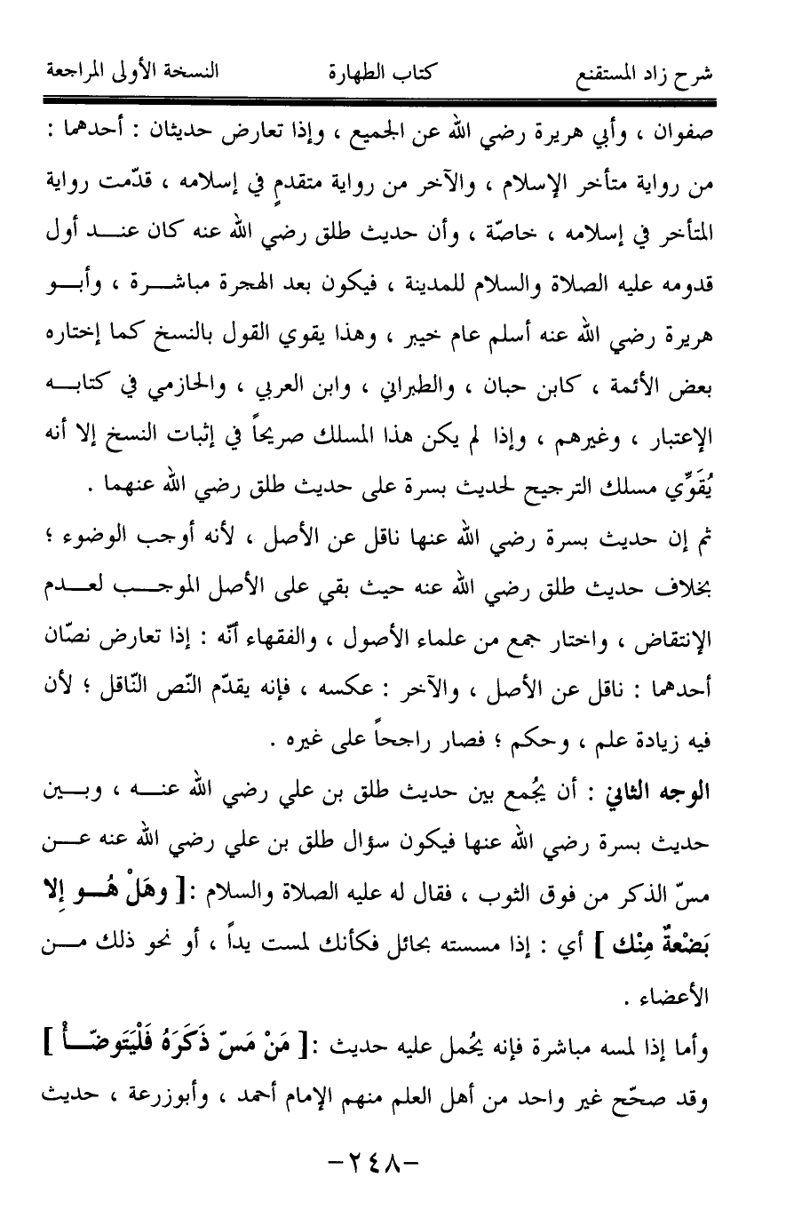 صفوان، وأبي هريرة رضي الله عن الجميع، وإذا تعارض حديثان: أحدهما: من رواية متأخر الإسلام، والآخر من رواية متقدمٍ في إسلامه، قدّمت رواية المتأخر في إسلامه، خاصّة، وأن حديث طلق رضي الله عنه كان عند أول قدومه عليه الصلاة والسلام للمدينة، فيكون بعد الهجرة مباشرة، وأبو هريرة رضي الله عنه أسلم عام خيبر، وهذا يقوي القول بالنسخ كما إختاره بعض الأئمة، كابن حبان، والطبراني، وابن العربي، والحازمي في كتابه الإعتبار، وغيرهم، وإذا لم يكن هذا المسلك صريحاً في إثبات النسخ إلا أنه يُقَوِّي مسلك الترجيح لحديث بسرة على حديث طلق رضي الله عنهما.