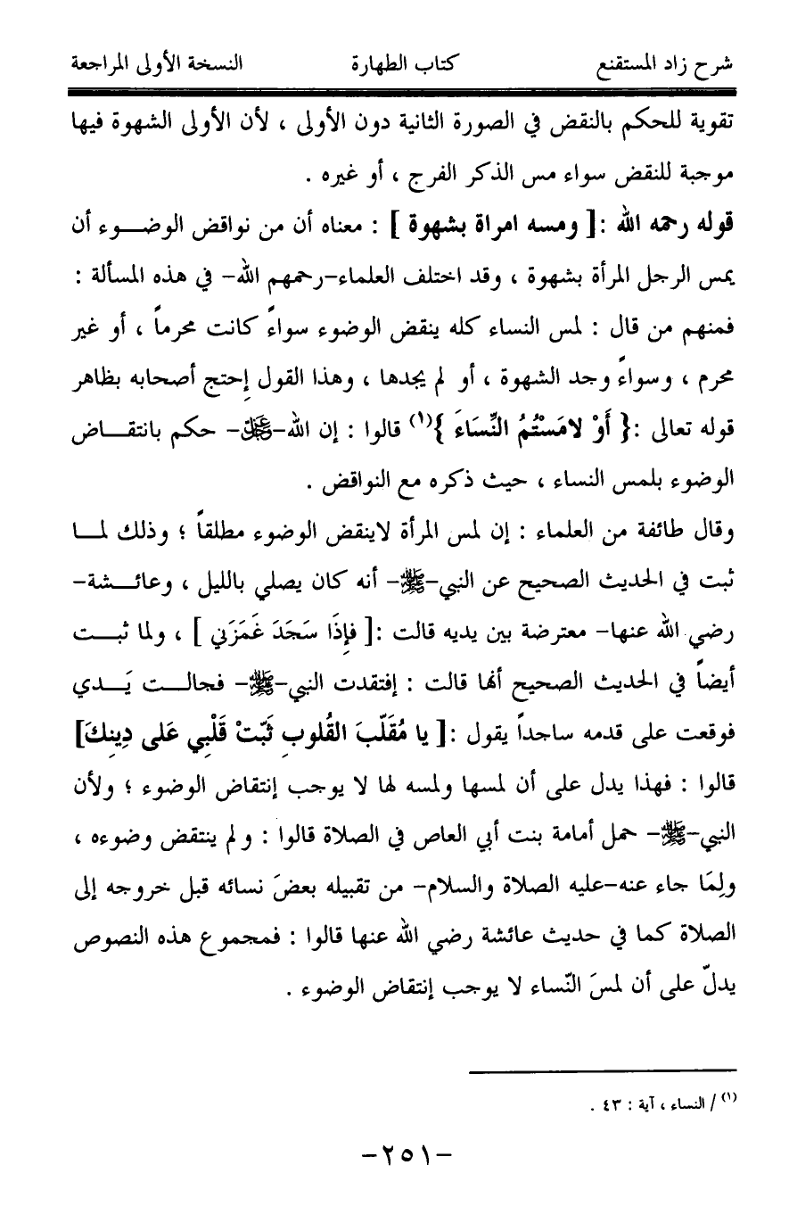 قوله رحمه الله: [ومسه امرأة بشهوة]: معناه أن من نواقض الوضوء أن يمس الرجل المرأة بشهوة، وقد اختلف العلماء -رحمهم الله- في هذه المسألة: فمنهم من قال: لمس النساء كله ينقض الوضوء سواءً كانت محرماً، أو غير محرم، وسواءً وجد الشهوة، أو لم يجدها، وهذا القول إِحتج أصحابه بظاهر قوله تعالى: {أَوْ لَامَسْتُمُ النِّسَاءَ} (¬1) قالوا: إن الله -عز وجل- حكم بانتقاض الوضوء بلمس النساء، حيث ذكره مع النواقض.