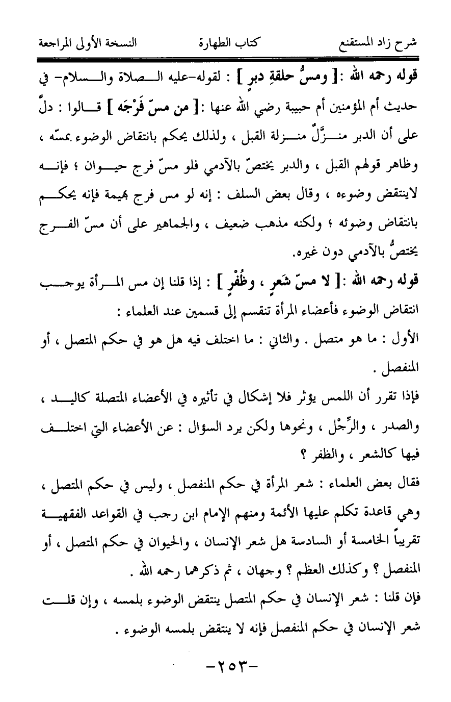 قوله رحمه الله: [ومسُّ حلقةِ دبرٍ]: لقوله -عليه الصلاة والسلام- في حديث أم الؤمنين أم حبيبة رضي الله عنها: [من مسّ فَرْجَه] قالوا: دل على أن الدبر منزَّلٌ منزلة القبل، ولذلك يحكم بانتقاض الوضوء بمسه، وظاهر قولهم القبل، والدبر يختصّ بالآدمي فلو مسّ فرج حيوان؛ فإنه لا ينتقض وضوءه، وقال بعض السلف: إنه لو مس فرج بهيمة فإنه يحكم بانتقاض وضوئه؛ ولكنه مذهب ضعيف، والجماهير على أن مس الفرج يختصُّ بالآدمي دون غيره.