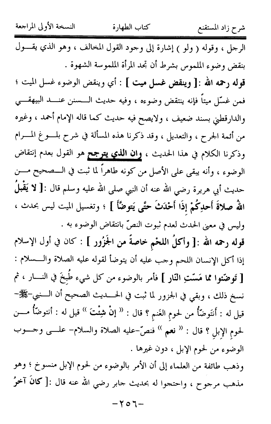 قوله رحمه الله: [وأكلُ اللحْمِ خاصةً من الجَزُور]: كان في أول الإسلام إذا أكل الإنسان اللحم وجب عليه أن يتوضأ لقوله عليه الصلاة والسلام: [تَوضّئوا مما مَسّتِ النّار] فأمر بالوضوء من كل شيء طُبِخَ في النار، ثم نسخ ذلك، وبقى في الجزور لما ثبت في الحديث الصحيح أن النبي -صَلَّى اللَّهُ عَلَيْهِ وَسَلَّمَ- قيل له: أنتَوضّأُ من لحومِ الغَنمِ؟ قال: " إنْ شئت " قيل له: أنتوضّأُ من لحومِ الإِبلِ؟ قال: " نعم " فنصّ -عليه الصلاة والسلام- على وجوب الوضوء من لحوم الإبل، دون غيرها.