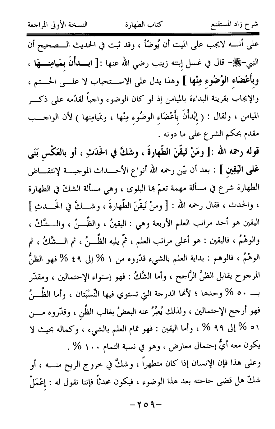 قوله رحمه الله: [ومَنْ تَيقّنَ الطّهارةَ، وشَكَّ في الحَدَثِ، أو بالعَكْسِ بَنَى عَلى اليَقِينِ]: بعد أن بيّن رحمه الله أنواع الأحداث الموجبة لإنتقاض الطهارة شرع في مسألة مهمة تعمّ بها البلوى، وهي مسألة الشكّ في الطهارة، والحدث، فقال رحمه الله: [ومنْ تَيقّنَ الطّهارةَ، وشكَّ في الحَدثِ] اليقين هو أحد مراتب العلم الأربعة وهي: اليقينُ، والظنُ، والشَّكُ، والوهْمُ، فاليقين: هو أعلى مراتب العلم، ثمّ يليه الظنُ، ثم الشَّكُ، ثم الوهْمُ، فالوهم: بداية العلم بالشيء قدّروه من 1% إلى 49% فهو الظنُّ المرجوح يقابل الظنَّ الرَّاجح، وأما الشك: فهو إستواء الإحتمالين، ومقدّر بـ 50% وحدها؛ لأنها الدرجة التي تستوي فيها النِّسْبَتان، وأما الظنُ فهو أرجح الإحتمالين، ولذلك يُعبِّرُ عنه البعضُ بغالب الظنِ، وقدّروه من 51% إلى 99%، وأما اليقين: فهو تمام العلم بالشيء، وكماله بحيث لا يكون معه أيُّ إحتمال معارض، وهو في نسبة التمام 100%.