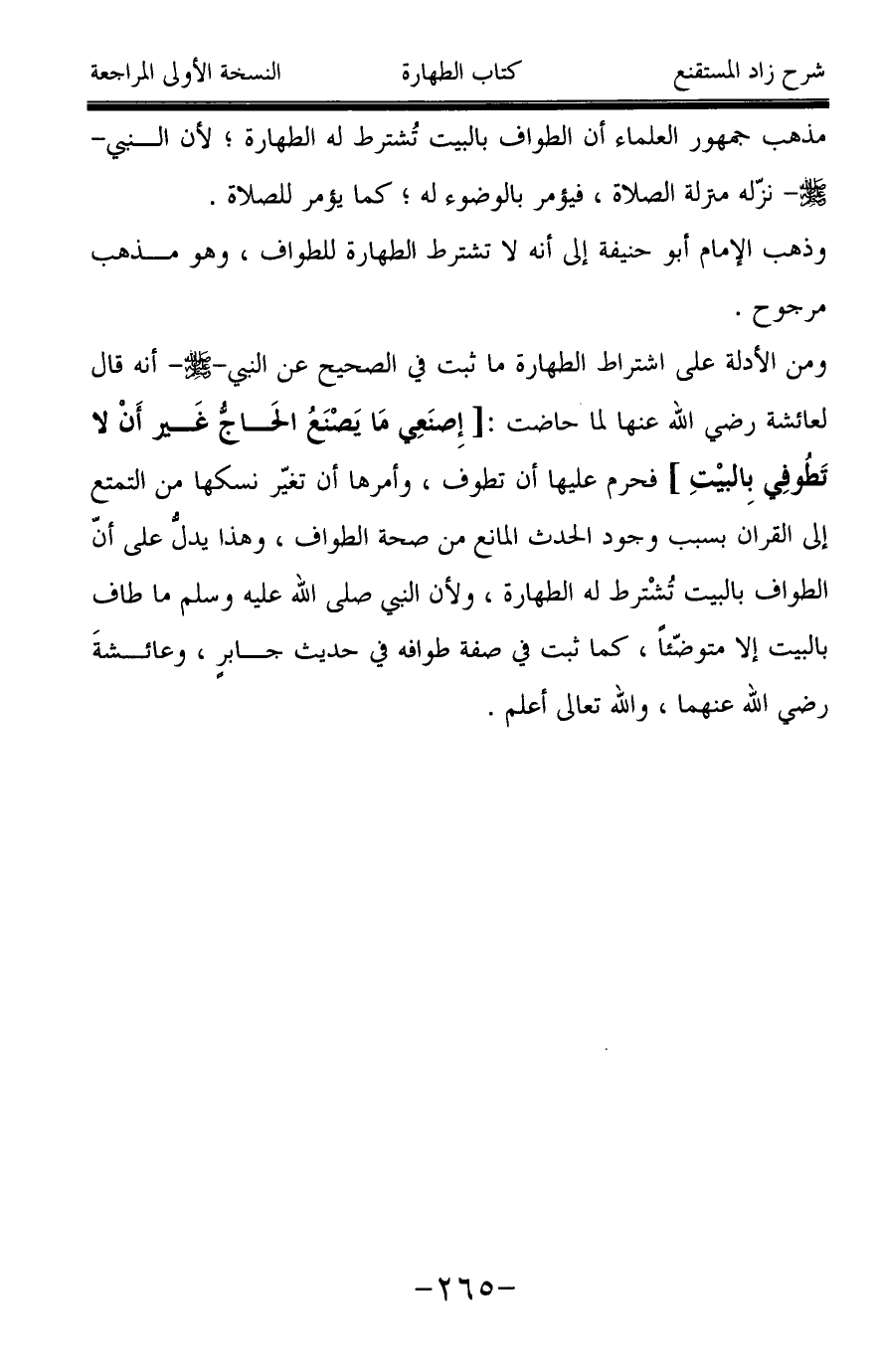 ومن الأدلة على اشتراط الطهارة ما ثبت في الصحيح عن النبي -صَلَّى اللَّهُ عَلَيْهِ وَسَلَّمَ- أنه قال لعائشة رضي الله عنها لما حاضت: [إِصنَعِي مَا يَصْنَعُ الحاجُّ غَير أَنْ لا تَطُوفِي بِالبيْتِ] فحرم عليها أن تطوف، وأمرها أن تغيّر نسكها من التمتع إلى القران بسبب وجود الحدث المانع من صحة الطواف، وهذا يدلُّ على أنّ الطواف بالبيت تُشْترط له الطهارة، ولأن النبي صَلَّى اللَّهُ عَلَيْهِ وَسَلَّمَ ما طاف بالبيت إلا متوضّئاً، كما ثبت في صفة طوافه في حديث جابرٍ، وعائشةَ رضي الله عنهما، والله تعالى أعلم.