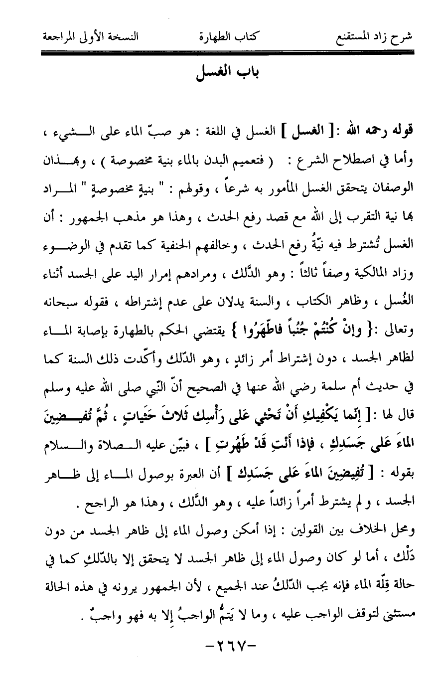قوله رحمه الله: [الغسل] الغسل في اللغة: هو صبّ الماء على الشيء، وأما في اصطلاح الشرع: (فتعميم البدن بالماء بنية مخصوصة)، وبهذان الوصفان يتحقق الغسل المأمور به شرعاً، وقولهم: " بنيةٍ مخصوصةٍ " المراد بها نية التقرب إلى الله مع قصد رفع الحدث، وهذا هو مذهب الجمهور: أن الغسل تُشترط فيه نيّةُ رفع الحدث، وخالفهم الحنفية كما تقدم في الوضوء وزاد المالكية وصفاً ثالثاً: وهو الدَّلك، ومرادهم إمرار اليد على الجسد أثناء الغُسل، وظاهر الكتاب، والسنة يدلان على عدم إشتراطه، فقوله سبحانه وتعالى: {وَإِنْ كُنْتُمْ جُنُبًا فَاطَّهَّرُوا} يقتضي الحكم بالطهارة بإصابة الماء لظاهر الجسد، دون إشتراط أمر زائدٍ، وهو الدّلك وأكّدت ذلك السنة كما في حديث أم سلمة رضي الله عنها في الصحيح أنّ النبي صَلَّى اللَّهُ عَلَيْهِ وَسَلَّمَ قال لها: [إنما يَكْفِيكِ أَنْ تَحْثي عَلى رَأسِك ثَلاثَ حَثَياتٍ، ثُمَّ تُفيضينَ الماءَ عَلى جَسَدِكِ، فإذا أَنتِ قَدْ طَهُرتِ]، فبيّن عليه الصلاة والسلام بقوله: [تُفِيضِينَ الماءَ عَلى جَسَدِك] أن العبرة بوصول الماء إلى ظاهر الجسد، ولم يشترط أمراً زائداً عليه، وهو الدَّلك، وهذا هو الراجح.