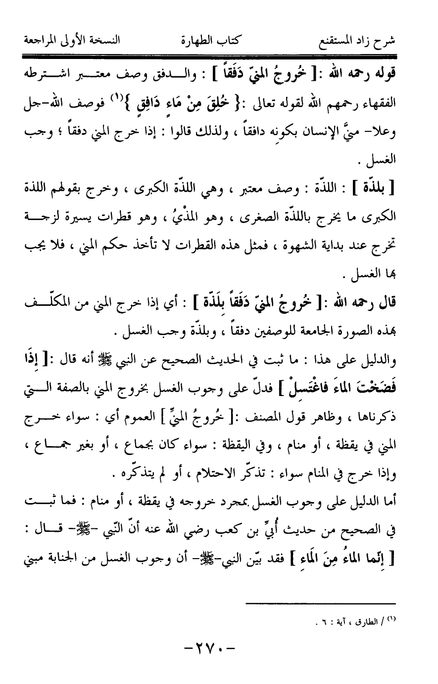 قوله رحمه الله: [خُروجُ المنيّ دَفَقاً]: والدفق وصف معتبر اشترطه الفقهاء رحمهم الله لقوله تعالى: {خُلِقَ مِنْ مَاءٍ دَافِقٍ} (¬1) فوصف الله -جل وعلا- منيَّ الإنسان بكونِه دافقاً، ولذلك قالوا: إذا خرج المني دفقاً؛ وجب الغسل.