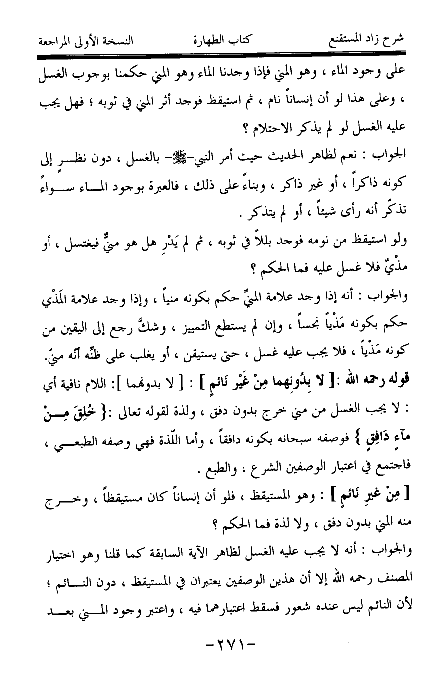 والجواب: أنه لا يجب عليه الغسل لظاهر الآية السابقة كما قلنا وهو اختيار المصنف رحمه الله إلا أن هذين الوصفين يعتبران في المستيقظ، دون النائم؛ لأن النائم ليس عنده شعور فسقط اعتبارهما فيه، واعتبر وجود المني بعد