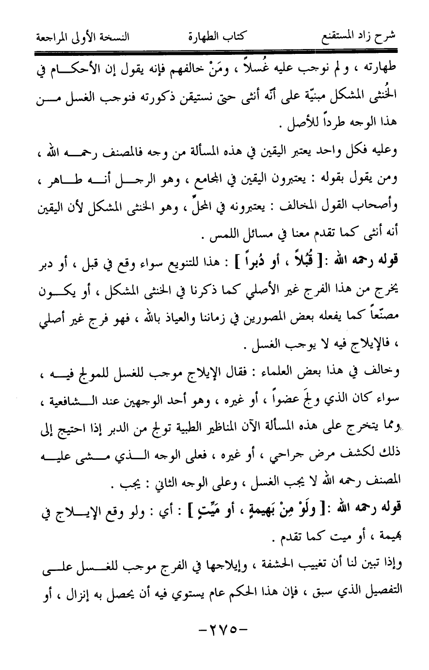 طهارته، ولم نوجب عليه غُسلاً، ومَنْ خالفهم فإنه يقول إن الأحكام في الخُنثى المشكل مبنيّة على أنه أنثى حتى نستيقن ذكورته فنوجب الغسل من هذا الوجه طرداً للأصل.