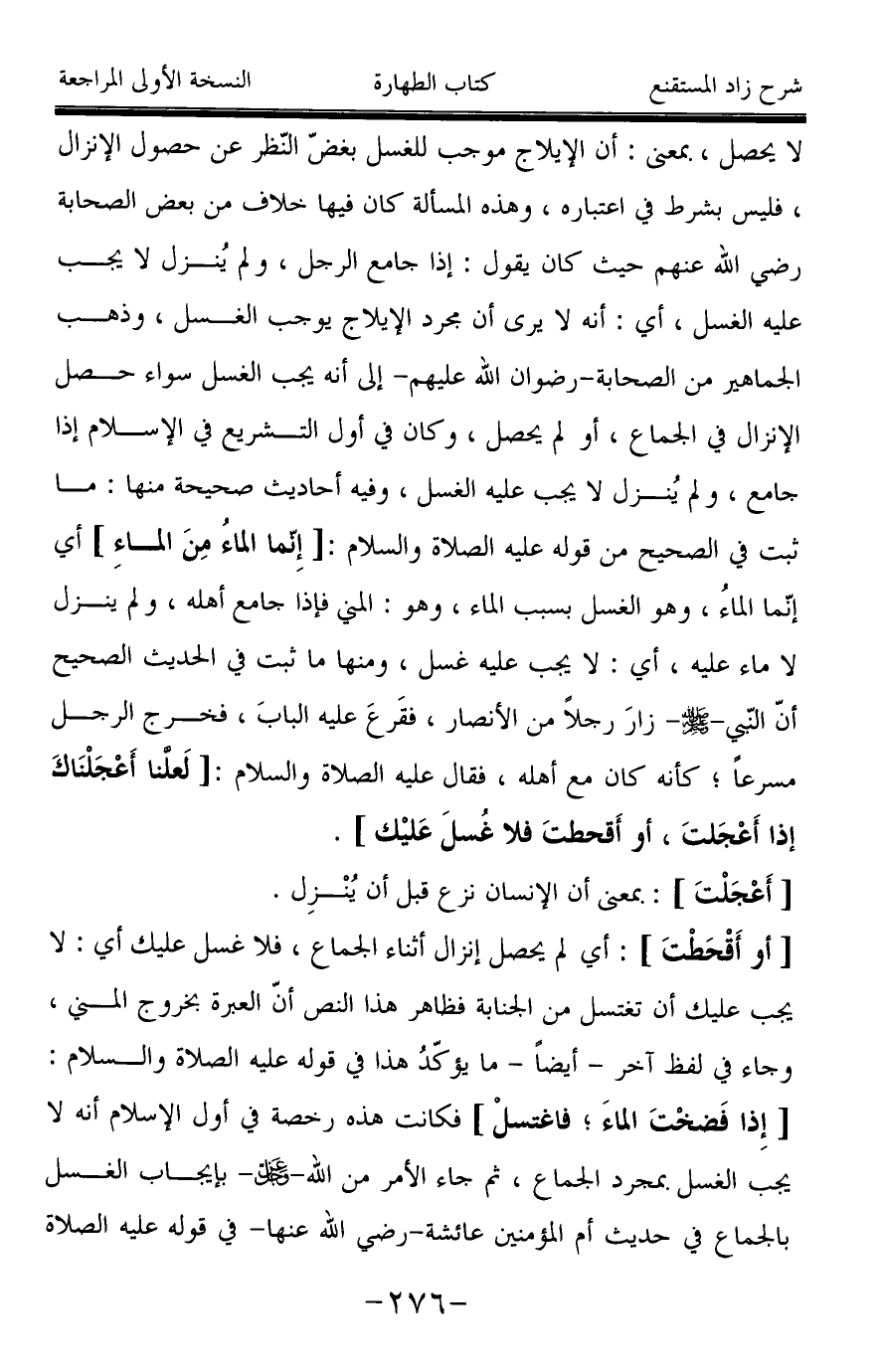 لا يحصل، بمعنى: أن الإيلاج موجب للغسل بغضّ النّظر عن حصول الإنزال، فليس بشرط في اعتباره، وهذه المسألة كان فيها خلاف من بعض الصحابة رضي الله عنهم حيث كان يقول: إذا جامع الرجل، ولم يُنزل لا يجب عليه الغسل، أي: أنه لا يرى أن مجرد الإيلاج يوجب الغسل، وذهب الجماهير من الصحابة -رضوان الله عليهم- إلى أنه يجب الغسل سواء حصل الإنزال في الجماع، أو لم يحصل، وكان في أول التشريع في الإسلام إذا جامع، ولم يُنزل لا يجب عليه الغسل، وفيه أحاديث صحيحة منها: ما ثبت في الصحيح من قوله عليه الصلاة والسلام: [إنما الماءُ مِنَ الماءِ] أي إنّما الماءُ، وهو الغسل بسبب الماء، وهو: المني فإذا جامع أهله، ولم ينزل لا ماء عليه، أي: لا يجب عليه غسل، ومنها ما ثبت في الحديث الصحيح أنّ النبي -صَلَّى اللَّهُ عَلَيْهِ وَسَلَّمَ- زارَ رجلاً من الأنصار، فقَرعَ عليه البابَ، فخرج الرجل مسرعاً؛ كأنه كان مع أهله، فقال عليه الصلاة والسلام: [لَعلَّنا أَعْجَلْنَاكَ إذا أَعْجَلتَ، أو أَقحطتَ فلا غُسلَ عَليْك].