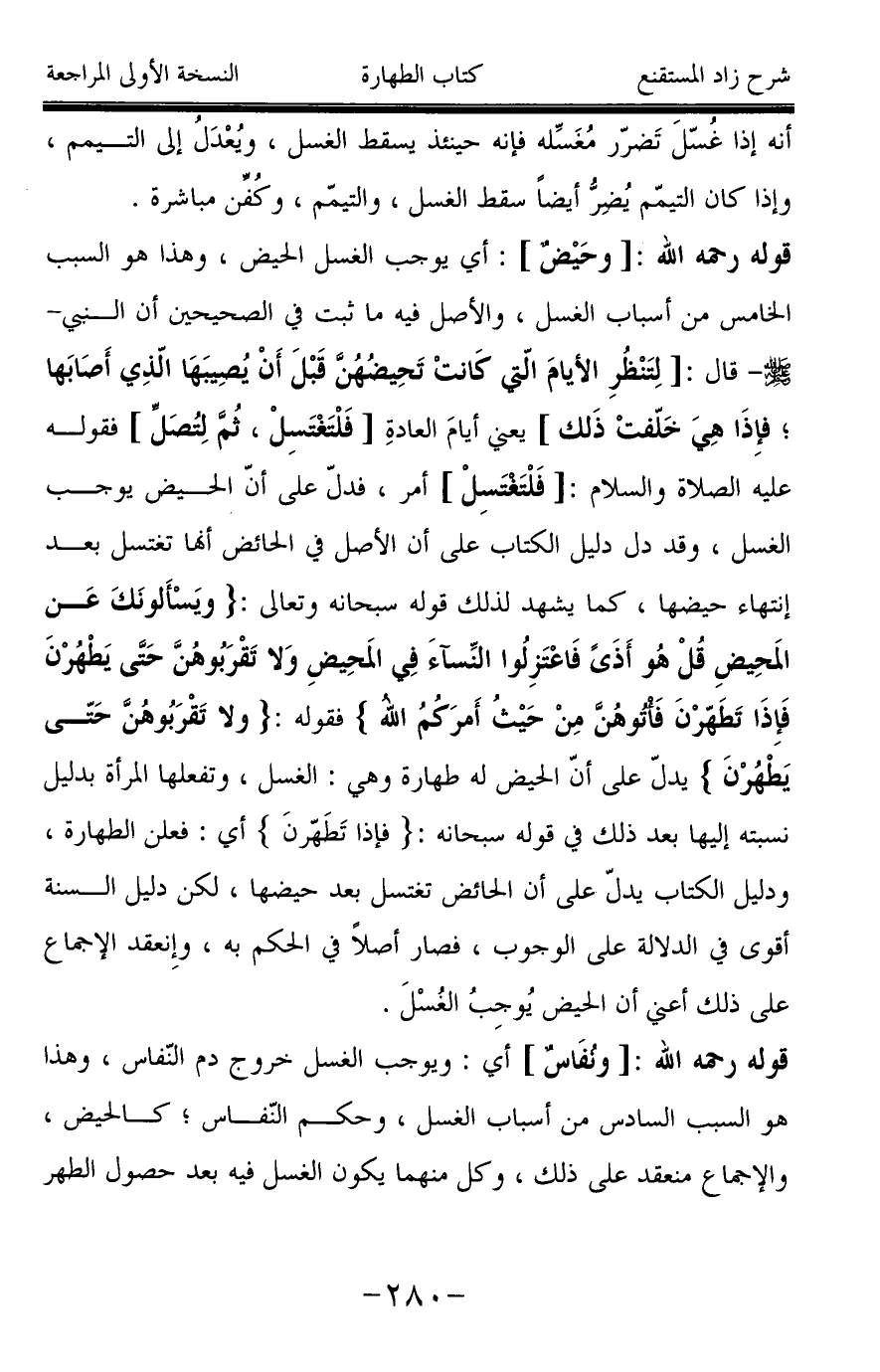 قوله رحمه الله: [وحَيْضٌ]: أي يوجب الغسل الحيض، وهذا هو السبب الخامس من أسباب الغسل، والأصل فيه ما ثبت في الصحيحين أن النبي -صَلَّى اللَّهُ عَلَيْهِ وَسَلَّمَ- قال: [لِتَنْظُرِ الأيامَ الّتي كَانتْ تَحِيضهُنَّ قَبْلَ أَنْ يُصيبَهَا الّذِي أَصَابَها؛ فإذَا هِيَ خَلّفتْ ذَلك] يعني أيامَ العادةِ [فَلْتَغْتَسِلْ، ثُمَّ لِتُصَلِّ] فقوله عليه الصلاة والسلام: [فَلْتَغتَسِلْ] أمر، فدلّ على أنّ الحيض يوجب الغسل، وقد دل دليل الكتاب على أن الأصل في الحائض أنها تغتسل بعد إنتهاء حيضها، كما يشهد لذلك قوله سبحانه وتعالى: {وَيَسْأَلُونَكَ عَنِ الْمَحِيضِ قُلْ هُوَ أَذًى فَاعْتَزِلُوا النِّسَاءَ فِي الْمَحِيضِ وَلَا تَقْرَبُوهُنَّ حَتَّى يَطْهُرْنَ فَإِذَا تَطَهَّرْنَ فَأْتُوهُنَّ مِنْ حَيْثُ أَمَرَكُمُ اللَّهُ} فقوله: {وَلَا تَقْرَبُوهُنَّ حَتَّى يَطْهُرْنَ} يدلّ على أنّ الحيض له طهارة وهي: الغسل، وتفعلها المرأة بدليل نسبته إليها بعد ذلك في قوله سبحانه: {فَإِذَا تَطَهَّرْنَ} أي: فعلن الطهارة، ودليل الكتاب يدلّ على أن الحائض تغتسل بعد حيضها، لكن دليل السنة أقوى في الدلالة على الوجوب، فصار أصلاً في الحكم به، وإِنعقد الإجماع على ذلك أعني أن الحيض يُوجِبُ الغُسْلَ.