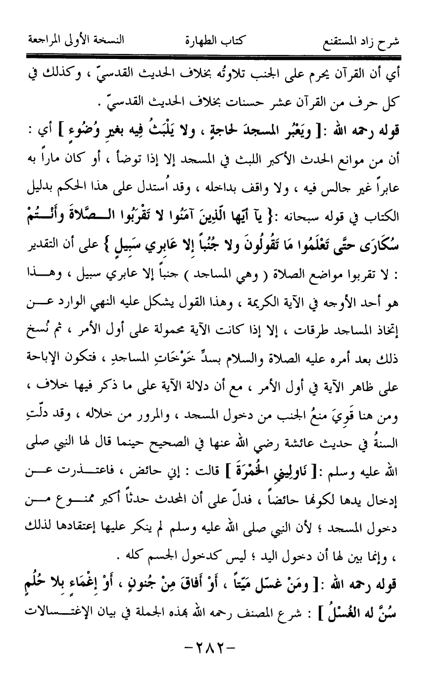 قوله رحمه الله: [ويَعْبُر المسجدَ لحاجةٍ، ولا يَلْبَثُ فِيه بغيرِ وُضُوءٍ] أي: أن من موانع الحدث الأكبر اللبث في المسجد إلا إذا توضأ، أو كان ماراً به عابراً غير جالس فيه، ولا واقف بداخله، وقد اُستدل على هذا الحكم بدليل الكتاب في قوله سبحانه: {يَا أَيُّهَا الَّذِينَ آمَنُوا لَا تَقْرَبُوا الصَّلَاةَ وَأَنْتُمْ سُكَارَى حَتَّى تَعْلَمُوا مَا تَقُولُونَ وَلَا جُنُبًا إِلَّا عَابِرِي سَبِيلٍ} على أن التقدير: لا تقربوا مواضع الصلاة (وهي المساجد) جنباً إلا عابري سبيل، وهذا هو أحد الأوجه في الآية الكريمة، وهذا القول يشكل عليه النهي الوارد عن إتخاذ المساجد طرقات، إلا إذا كانت الآية محمولة على أول الأمر، ثم نُسخ ذلك بعد أمره عليه الصلاة والسلام بسدِّ خَوْخَاتِ المساجدِ، فتكون الإباحة على ظاهر الآية في أول الأمر، مع أن دلالة الآية على ما ذكر فيها خلاف، ومن هنا قَوِيَ منعُ الجنب من دخول المسجد، والمرور من خلاله، وقد دلّتِ السنةُ في حديث عائشة رضي الله عنها في الصحيح حينما قال لها النبي صَلَّى اللَّهُ عَلَيْهِ وَسَلَّمَ: [نَاولِيني الخُمْرَةَ] قالت: إني حائض، فاعتذرت عن إدخال يدها لكونها حائضاً، فدلّ على أن المحدث حدثاً أكبر ممنوع من دخول المسجد؛ لأن النبي صَلَّى اللَّهُ عَلَيْهِ وَسَلَّمَ لم ينكر عليها إعتقادها لذلك، وإنما بين لها أن دخول اليد؛ ليس كدخول الجسم كله.