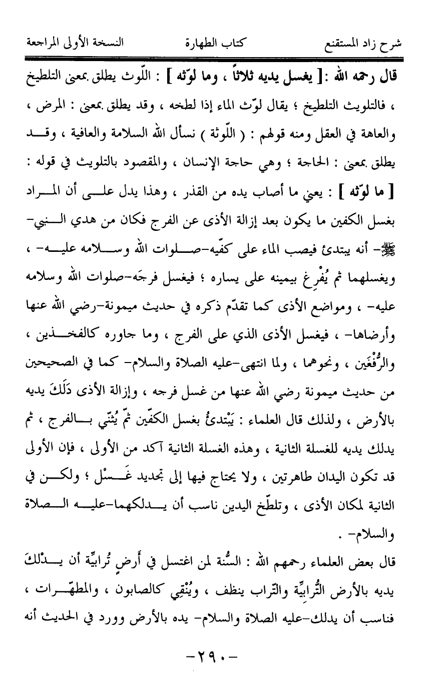 قال رحمه الله: [يغسل يديه ثلاثاً، وما لوّثه]: اللّوث يطلق بمعنى التلطيخ، فالتلويث التلطيخ، يقال لوّث الماء إذا لطخه، وقد يطلق بمعنى: المرض، والعاهة في العقل ومنه قولهم: (اللّوثة) نسأل الله السلامة والعافية، وقد يطلق بمعنى: الحاجة؛ وهي حاجة الإنسان، والمقصود بالتلويث في قوله: [ما لوثه]: يعني ما أصاب يده من القذر، وهذا يدل على أن المراد بغسل الكفين ما يكون بعد إزالة الأذى عن الفرج فكان من هدي النبي -صَلَّى اللَّهُ عَلَيْهِ وَسَلَّمَ- أنه يبتدئ فيصب الماء على كفّيه -صلوات الله وسلامه عليه-، ويغسلهما ثم يُفْرِغ بيمينه على يساره، فيغسل فرجَه -صلوات الله وسلامه عليه-، ومواضع الأذى كما تقدّم ذكره في حديث ميمونة -رضي الله عنها وأرضاها-، فيغسل الأذى الذي على الفرج، وما جاوره كالفخذين، والرُّفْغَين، ونحوهما، ولما انتهى -عليه الصلاة والسلام- كما في الصحيحين من حديث ميمونة رضي الله عنها من غسل فرجه، وإزالة الأذى دَلَكَ يديه بالأرض، ولذلك قال العلماء: يَبْتدئُ بغسل الكفّين ثمّ يُثنّي بالفرج، ثم يدلك يديه للغسلة الثانية، وهذه الغسلة الثانية آكد من الأولى، فإن الأولى قد تكون اليدان طاهرتين، ولا يحتاج فيها إلى تجديد غَسل؛ ولكن في الثانية لمكان الأذى، وتلطّخ اليدين ناسب أن يدلكهما -عليه الصلاة والسلام-.