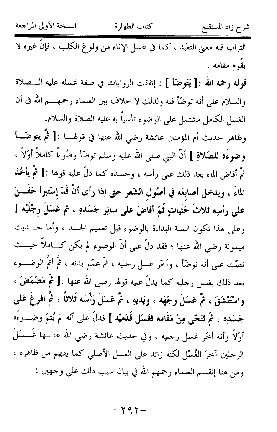 وظاهر حديث أم المؤمنين عائشة رضي الله عنها في قولها: [ثم يتوضأ وضوءَه للصّلاةِ] أنّ النبي صَلَّى اللَّهُ عَلَيْهِ وَسَلَّمَ توضّأ وضُوءاً كاملاً أوّلاً، ثم أفاض الماء بعد ذلك على رأسه، وجسده كما دلّ عليه قولها: [ثم يأخُذ الماءَ، ويدخل أصابِعَه في أصُولِ الشّعر حتى إذا رأى أنْ قَدْ إِسْتبرأ حَفَنَ على رأسِه ثلاثَ حَثَياتٍ ثُمّ أفاضَ على سائِر جَسَدهِ، ثم غسَلَ رِجْلَيْه] وعلى هذا تكون السنة البداءة بالوضوء قبل تعميم الجسد، وأما حديث ميمونة رضي الله عنها؛ فقد دلّ على أنّ الوضوء لم يكن كاملاً حيث نصّت على أنه توضّأ، وأخّر غسل رجليه، ثمّ عمّم بدنه، ثمَّ أتمَّ الوضوء بعد ذلك بغسل رجليه كما يدلّ عليه قولها رضي الله عنها: [ثمّ مَضْمَضَ، واسْتَنْشَقَ، ثم غسَلَ وجْهَه، ويَديهِ، ثم غسَلَ رَأسَه ثَلاثاً، ثم أفرغَ عَلى جَسَدِه، ثمّ تَنَحّى مِنْ مَقَامِه فغَسَل قَدَميْه] فدلّ على أنه لم يُتمّ وضوءَه أوّلاً وأنه أخّر غسل رجليه، وفي حديث عائشة رضي الله عنها غَسَلَ الرجلين آخرَ الغُسْل لكنه زائد على الغسل الأصلي كما يفهم من ظاهره، ومن هنا إنقسم العلماء رحمهم الله في بيان سبب ذلك على وجهين: