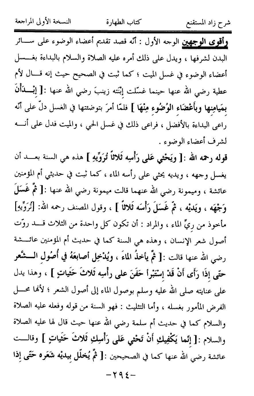 وأقوى الوجهين الوجه الأول: أنه قصد تقديم أعضاء الوضوء على سائر البدن لشرفها، ويدل على ذلك أمره عليه الصلاة والسلام بالبداءة بغسل أعضاء الوضوء في غسل الميت؛ كما ثبت في الصحيح حيث إنه قال لأم عطية رضي الله عنها حينما غسّلت إِبنته زينبَ رضي الله عنها: [إِبْدَأنَ بِمَيامنها وبأَعْضَاءِ الوُضُوءِ منهَا] فلمّا أمرَ بتوضئتها في الغسل دلّ على أنه راعى البداءة بالأفضل، فراعى ذلك في غسل الحي، والميت فدل على أنه لشرف أعضاء الوضوء.