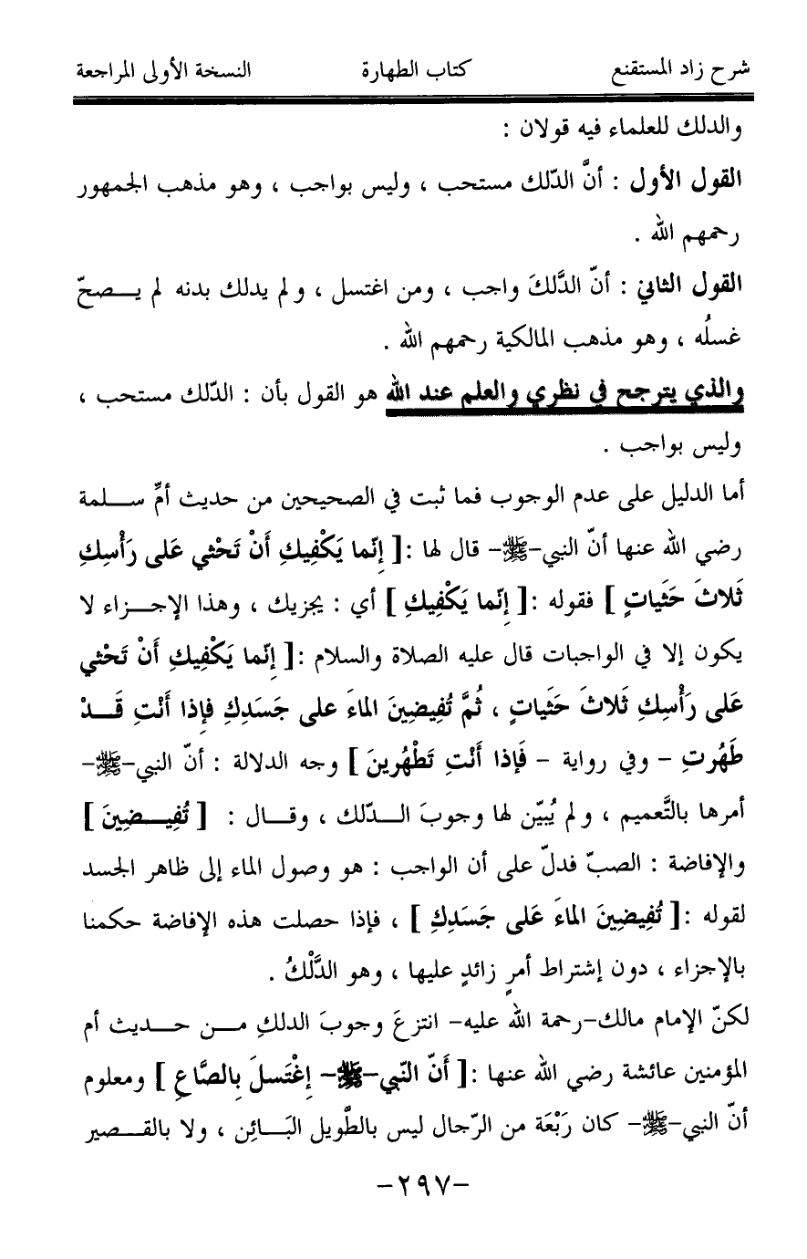 أما الدليل على عدم الوجوب فما ثبت في الصحيحين من حديث أمِّ سلمة رضي الله عنها أنّ النبي -صَلَّى اللَّهُ عَلَيْهِ وَسَلَّمَ- قال لها: [إِنما يَكْفِيكِ أَنْ تَحْثي عَلى رَأسِكِ ثَلاثَ حَثَياتٍ] فقوله: [إنما يَكْفِيكِ] أي: يجزيك، وهذا الإجزاء لا يكون إلا في الواجبات قال عليه الصلاة والسلام: [إِنما يَكْفِيكِ أَنْ تَحْثي عَلى رَأسكِ ثَلاثَ حَثَياتٍ، ثُمَّ تُفِيضينَ الماءَ على جَسَدِكِ فإِذا أَنتِ قَدْ طَهُرتِ -وفي رواية- فإذا أَنتِ تَطْهُرينَ] وجه الدلالة: أنّ النبي -صَلَّى اللَّهُ عَلَيْهِ وَسَلَّمَ- أمرها بالتَّعميم، ولم يُبيّن لها وجوبَ الدّلك، وقال: [تُفِيضِينَ] والإفاضة: الصبّ فدلّ على أن الواجب: هو وصول الماء إلى ظاهر الجسد لقوله: [تُفِيضِينَ الماءَ عَلى جَسَدِكِ]، فإذا حصلت هذه الإفاضة حكمنا بالإجزاء، دون إشتراط أمرٍ زائدٍ عليها، وهو الدَّلْكُ.