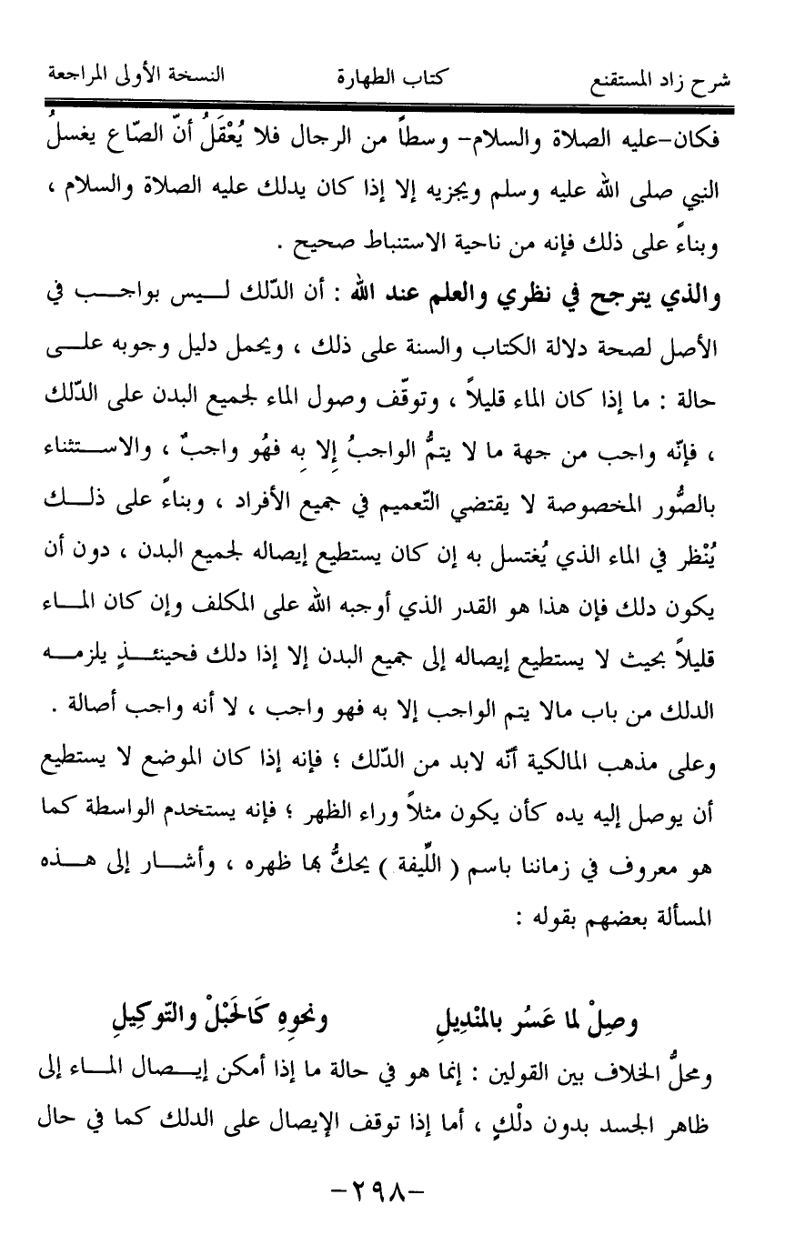 وعلى مذهب المالكية أنه لا بد من الدّلك؛ فإنه إذا كان الموضع لا يستطيع أن يوصل إليه يده كأن يكون مثلاً وراء الظهر؛ فإنه يستخدم الواسطة كما هو معروف في زماننا باسم (اللِّيفة) يحكُّ بها ظهره، وأشار إلى هذه المسألة بعضهم بقوله: