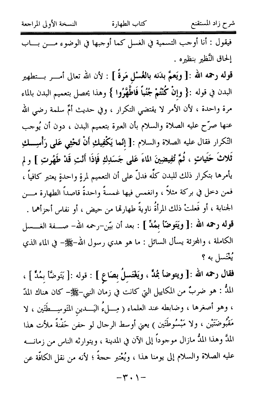 فقال رحمه الله: [ويتوضأ بمُدٍّ، ويَغْتَسِلُ بِصَاعٍ]: قوله: [يَتَوضَّأ بِمُدٍّ]، المدُّ: هو ضربٌ من المكاييل التي كانت في زمان النبي -صَلَّى اللَّهُ عَلَيْهِ وَسَلَّمَ- كان هناك المدّ، وهو أصغرها، وضابطه عند العلماء (مِلءُ اليَدينِ المتَوسِطَتَين، لا مَقْبُوضَتَيْن، ولا مَبْسُوطَتَين) يعني أوسط الرجال لو حفن حَفْنةً ملأت هذا المدَّ وهذا المدُّ مازال موجوداً إلى الآن في المدينة، ويتوارثه الناس من زمانه عليه الصلاة والسلام إلى يومنا هذا، ويُعْتبر حجة؛ لأنه من نقل الكافّة عن