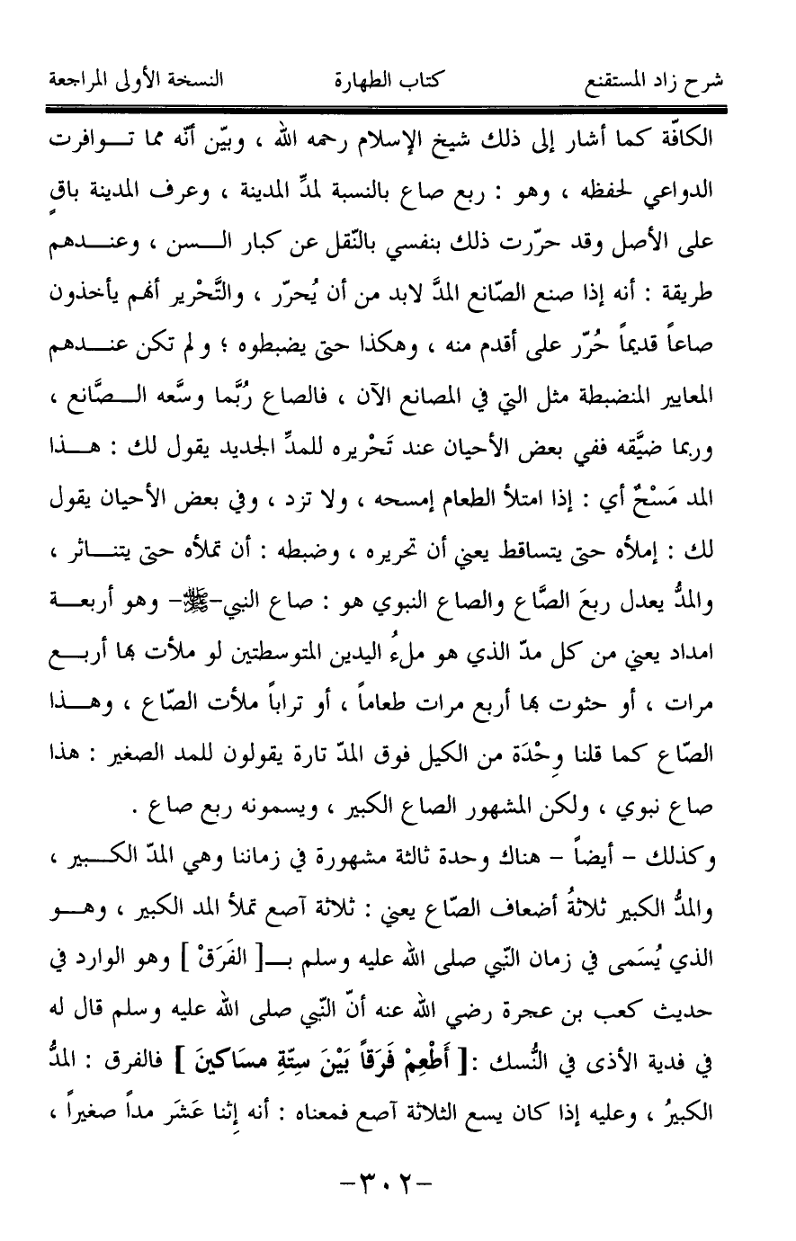 الكافّة كما أشار إلى ذلك شيخ الإسلام رحمه الله، وبيّن أنه مما توافرت الدواعي لحفظه، وهو: ربع صاع بالنسبة لمدِّ المدينة، وعرف المدينة باقٍ على الأصل وقد حرّرت ذلك بنفسي بالنّقل عن كبار السن، وعندهم طريقة: أنه إذا صنع الصّانع المدَّ لا بد من أن يُحرّر، والتَّحْرير أنهم يأخذون صاعاً قديماً حُرّر على أقدم منه، وهكذا حتى يضبطوه؛ ولم تكن عندهم المعايير المنضبطة مثل التي في المصانع الآن، فالصاع رُبَّما وسَّعه الصَّانع، وربما ضيَّقه ففي بعض الأحيان عند تَحْريره للمدِّ الجديد يقول لك: هذا المد مَسْح أي: إذا امتلأ الطعام إمسحه، ولا تزد، وفي بعض الأحيان يقول لك: إملأه حتى يتساقط يعني أن تحريره، وضبطه: أن تملأه حتى يتناثر، والمدُّ يعدل ربعَ الصَّاع والصاع النبوي هو: صاع النبي -صَلَّى اللَّهُ عَلَيْهِ وَسَلَّمَ- وهو أربعة امداد يعني من كل مدّ الذي هو ملءُ اليدين المتوسطتين لو ملأت بها أربع مرات، أو حثوت بها أربع مرات طعاماً، أو تراباً ملأت الصّاع، وهذا الصّاع كما قلنا وِحْدَة من الكيل فوق المدّ تارة يقولون للمد الصغير: هذا صاع نبوي، ولكن المشهور الصاع الكبير، ويسمونه ربع صاع.