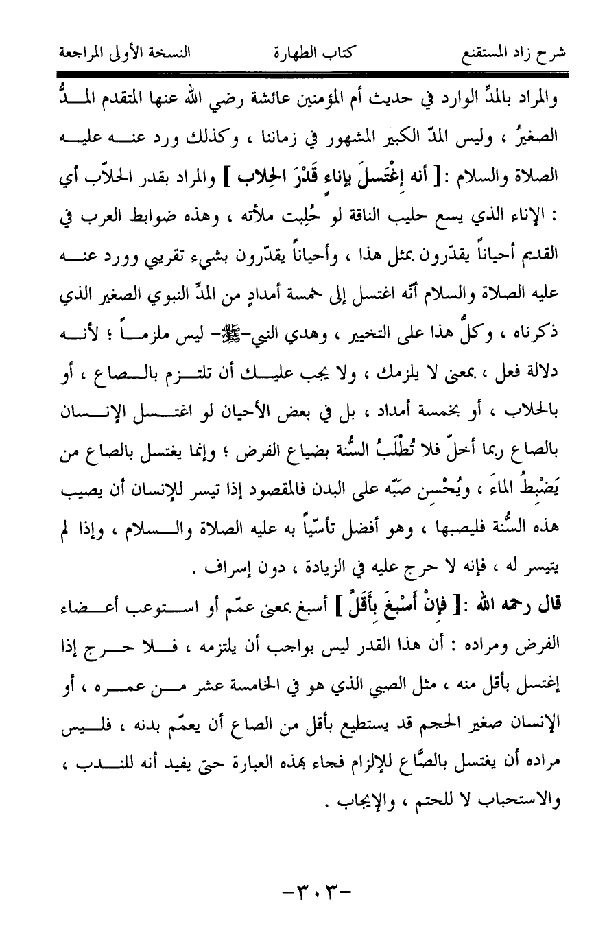 والمراد بالمدِّ الوارد في حديث أم المؤمنين عائشة رضي الله عنها المتقدم المدُّ الصغيرُ، وليس المدّ الكبير المشهور في زماننا، وكذلك ورد عنه عليه الصلاة والسلام: [أنه إِغْتَسلَ بإناءٍ قَدْرَ الحِلاب] والمراد بقدر الحلاّب أي: الإناء الذي يسع حليب الناقة لو حُلِبت ملأته، وهذه ضوابط العرب في القديم؛ أحياناً يقدّرون بمثل هذا، وأحياناً يقدّرون بشيء تقريبي وورد عنه عليه الصلاة والسلام أنه اغتسل إلى خمسة أمدادٍ من المدِّ النبوي الصغير الذي ذكرناه، وكلُّ هذا على التخيير، وهدي النبي -صَلَّى اللَّهُ عَلَيْهِ وَسَلَّمَ- ليس ملزماً؛ لأنه دلالة فعل، بمعنى لا يلزمك، ولا يجب عليك أن تلتزم بالصاع، أو بالحلاب، أو بخمسة أمداد، بل في بعض الأحيان لو اغتسل الإنسان بالصاع ربما أخلّ فلا تُطْلَبُ السُّنة بضياع الفرض؛ وإنما يغتسل بالصاع من يَضْبِطُ الماءَ، ويُحْسِن صَبّه على البدن فالمقصود إذا تيسر للإنسان أن يصيب هذه السُّنة فليصبها، وهو أفضل تأسّياً به عليه الصلاة والسلام، وإذا لم يتيسر له، فإنه لا حرج عليه في الزيادة، دون إسراف.