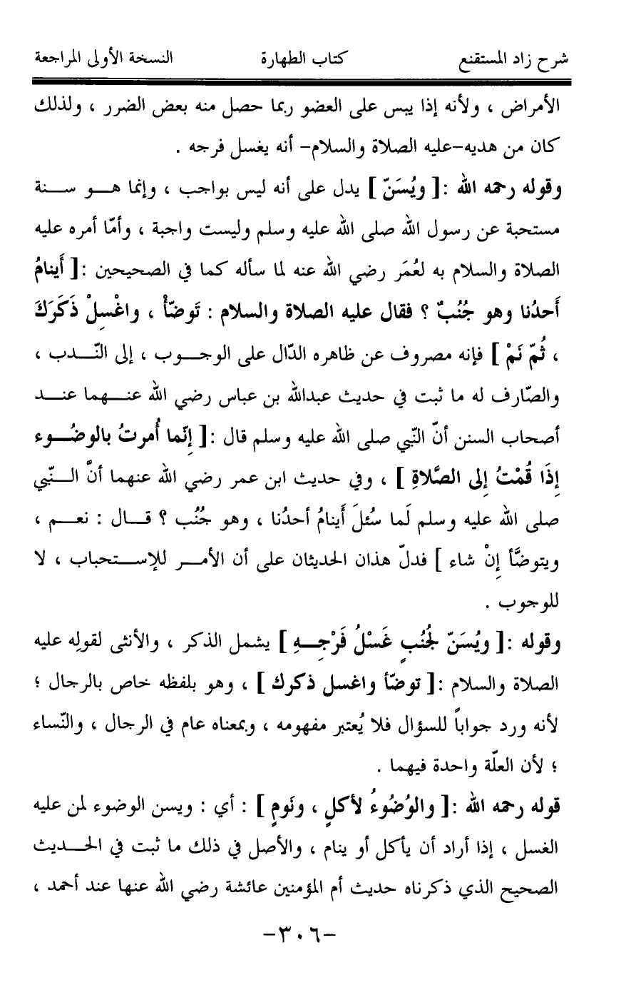 وقوله رحمه الله: [ويُسَنّ] يدل على أنه ليس بواجب، وإنما هو سنة مستحبة عن رسول الله صَلَّى اللَّهُ عَلَيْهِ وَسَلَّمَ وليست واجبة، وأمّا أمره عليه الصلاة والسلام به لعُمَر رضي الله عنه لما سأله كما في الصحيحين: [أَينامُ أَحدُنا وهو جُنُبٌ؟ فقال عليه الصلاة والسلام: تَوضّأ، واغْسِلْ ذَكَرَكَ، ثُمّ نَمْ] فإنه مصروف عن ظاهره الدّال على الوجوب، إلى النّدب، والصّارف له ما ثبت في حديث عبد الله بن عباس رضي الله عنهما عند أصحاب السنن أنّ النبي صَلَّى اللَّهُ عَلَيْهِ وَسَلَّمَ قال: [إنما أمرتُ بالوضُوء إِذَا قُمْتُ إِلى الصَّلاةِ]، وفي حديث ابن عمر رضي الله عنهما أن النبي صَلَّى اللَّهُ عَلَيْهِ وَسَلَّمَ لَما سُئلَ أَينامُ أحدُنا، وهو جُنُب؟ قال: نعم، ويتوضَّأ إِنْ شاء] فدلّ هذان الحديثان على أن الأمر للإستحباب، لا للوجوب.