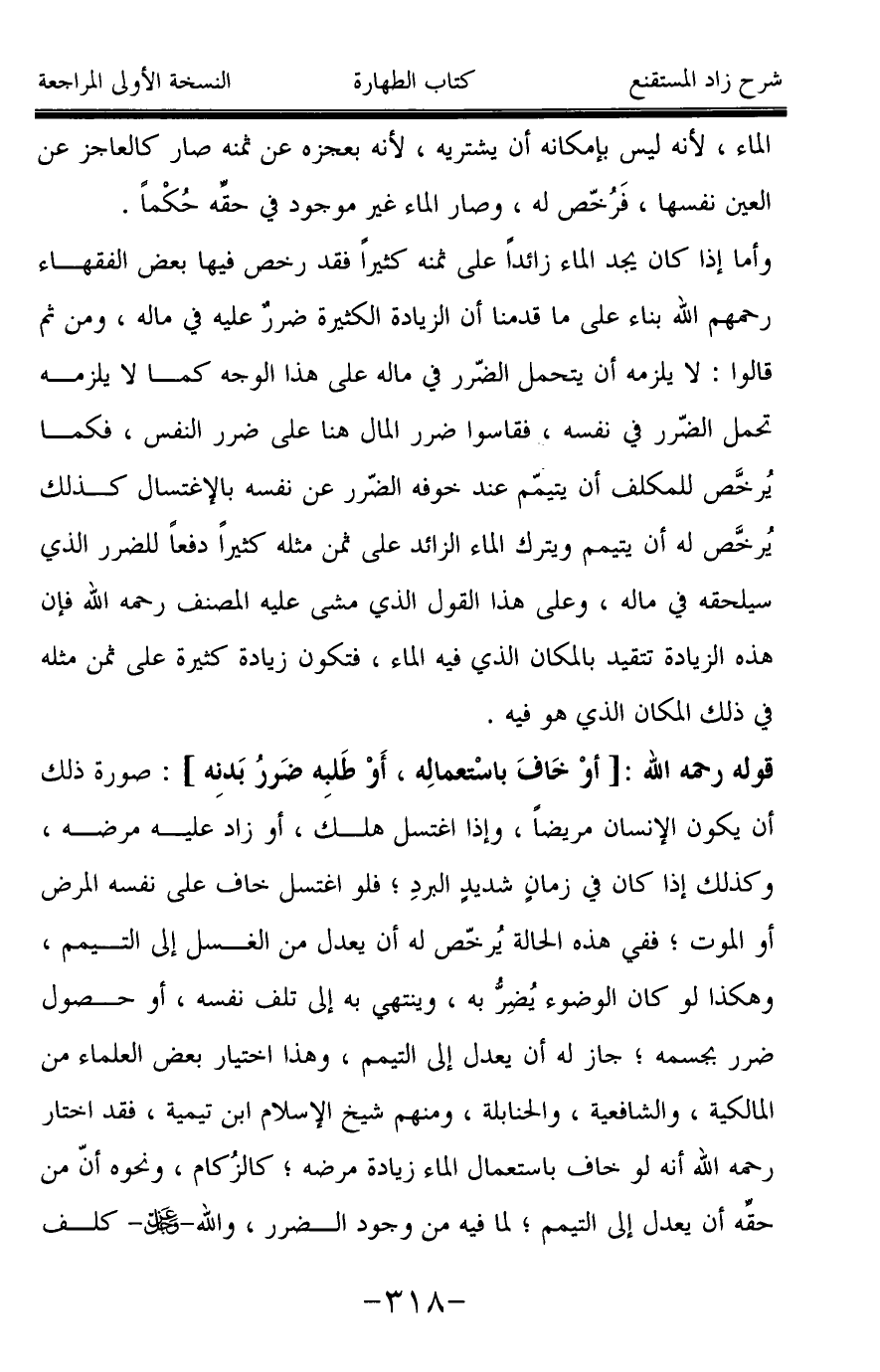وأما إذا كان يجد الماء زائداً على ثمنه كثيراً فقد رخص فيها بعض الفقهاء رحمهم الله بناء على ما قدمنا أن الزيادة الكثيرة ضررٌ عليه في ماله، ومن ثم قالوا: لا يلزمه أن يتحمل الضّرر في ماله على هذا الوجه كما لا يلزمه تحمل الضّرر في نفسه، فقاسوا ضرر المال هنا على ضرر النفس، فكما يُرخَّص للمكلف أن يتيمّم عند خوفه الضّرر عن نفسه بالإغتسال كذلك يُرخَّص له أن يتيمم ويترك الماء الزائد على ثمن مثله كثيراً دفعاً للضرر الذي سيلحقه في ماله، وعلى هذا القول الذي مشى عليه المصنف رحمه الله فإن هذه الزيادة تتقيد بالمكان الذي فيه الماء، فتكون زيادة كثيرة على ثمن مثله في ذلك المكان الذي هو فيه.