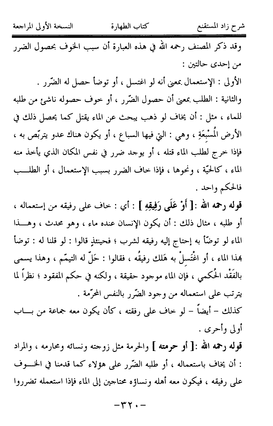 قوله رحمه الله: [أو حرمته] والحرمة مثل زوجته ونسائه ومحارمه، والمراد: أن يخاف باستعماله، أو طلبه الضّرر على هؤلاء كما قدمنا في الخوف على رفيقه، فيكون معه أهله ونساؤه محتاجين إلى الماء فإذا استعمله تضرروا
