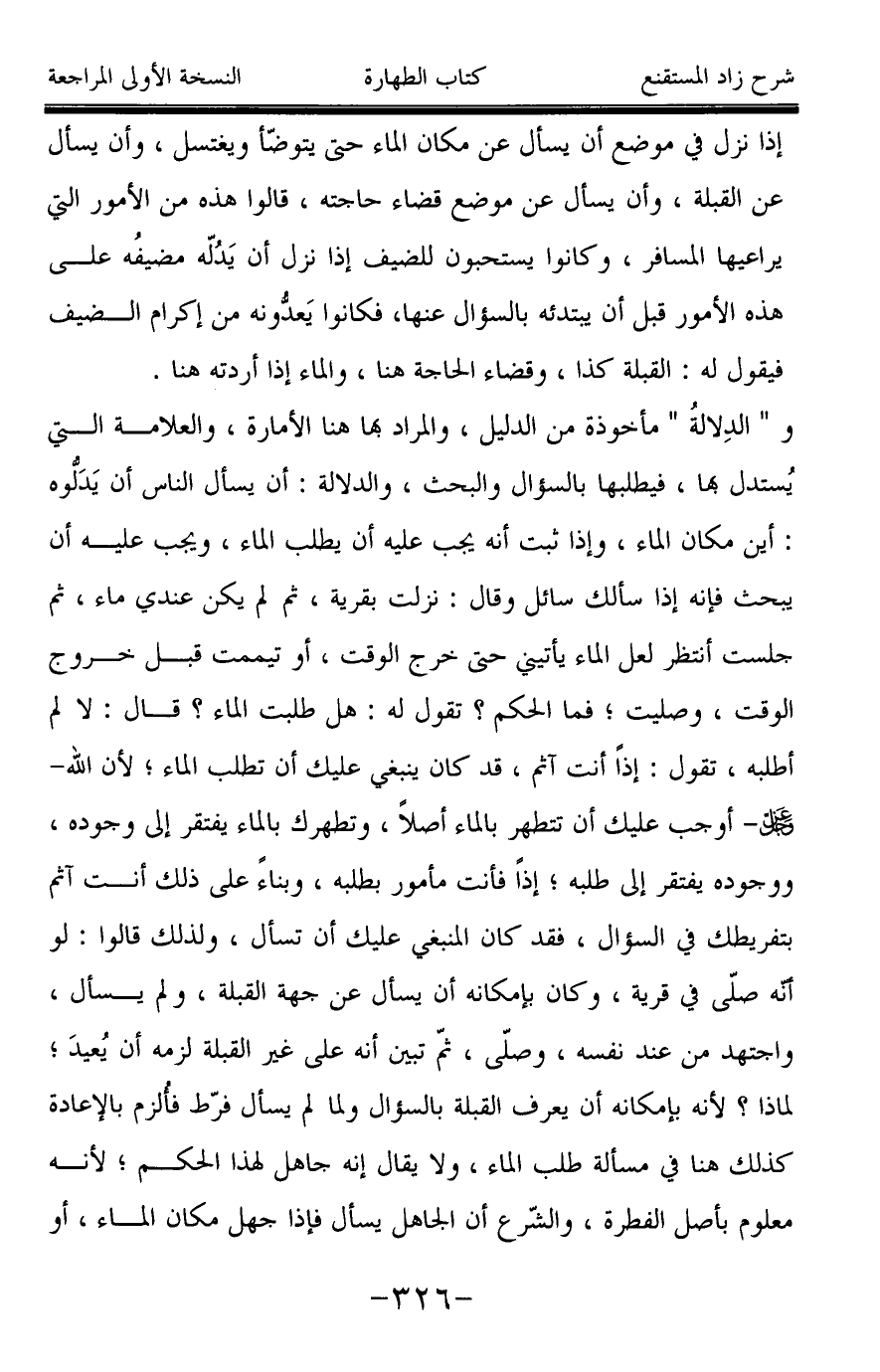 إذا نزل في موضع أن يسأل عن مكان الماء حتى يتوضّأ ويغتسل، وأن يسأل عن القبلة، وأن يسأل عن موضع قضاء حاجته، قالوا هذه من الأمور التي يراعيها المسافر، وكانوا يستحبون للضيف إذا نزل أن يَدُلّه مضيفُه على هذه الأمور قبل أن يبتدئه بالسؤال عنها، فكانوا يَعدُّونه من إكرام الضيف فيقول له: القبلة كذا، وقضاء الحاجة هنا، والماء إذا أردته هنا.