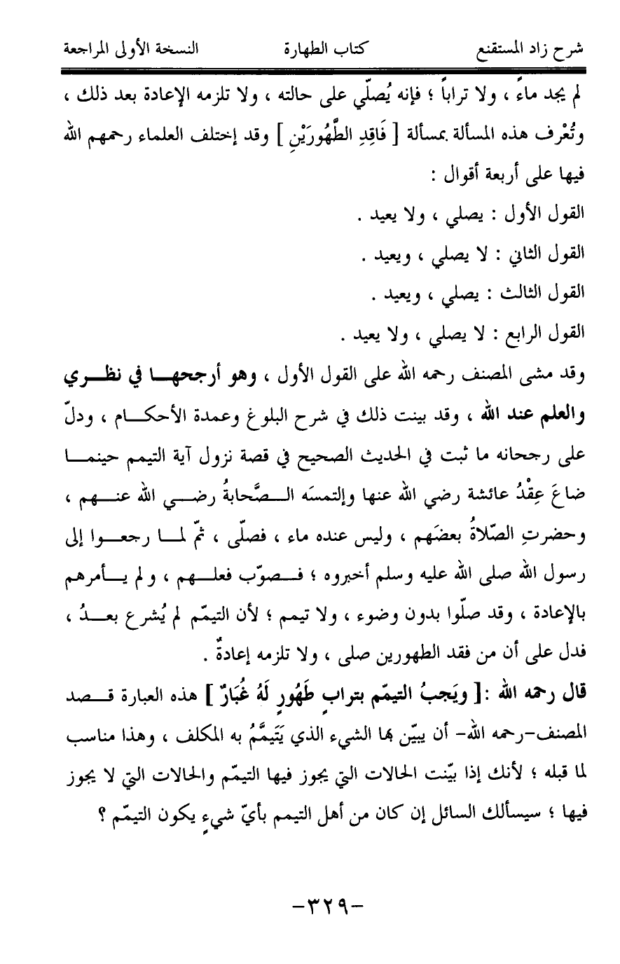 وقد مشى المصنف رحمه الله على القول الأول، وهو أرجحها في نظري والعلم عند الله، وقد بينت ذلك في شرح البلوغ وعمدة الأحكام، ودلّ على رجحانه ما ثبت في الحديث الصحيح في قصة نزول آية التيمم حينما ضاعَ عِقْدُ عائشة رضي الله عنها وإلتمسَه الصَّحابةُ رضي الله عنهم، وحضرتِ الصّلاةُ بعضَهم، وليس عنده ماء، فصلّى، ثمّ لما رجعوا إلى رسول الله صَلَّى اللَّهُ عَلَيْهِ وَسَلَّمَ أخبروه؛ فصوّب فعلهم، ولم يأمرهم بالإعادة، وقد صلّوا بدون وضوء، ولا تيمم؛ لأن التيمّم لم يُشرع بعدُ، فدل على أن من فقد الطهورين صلى، ولا تلزمه إعادةٌ.