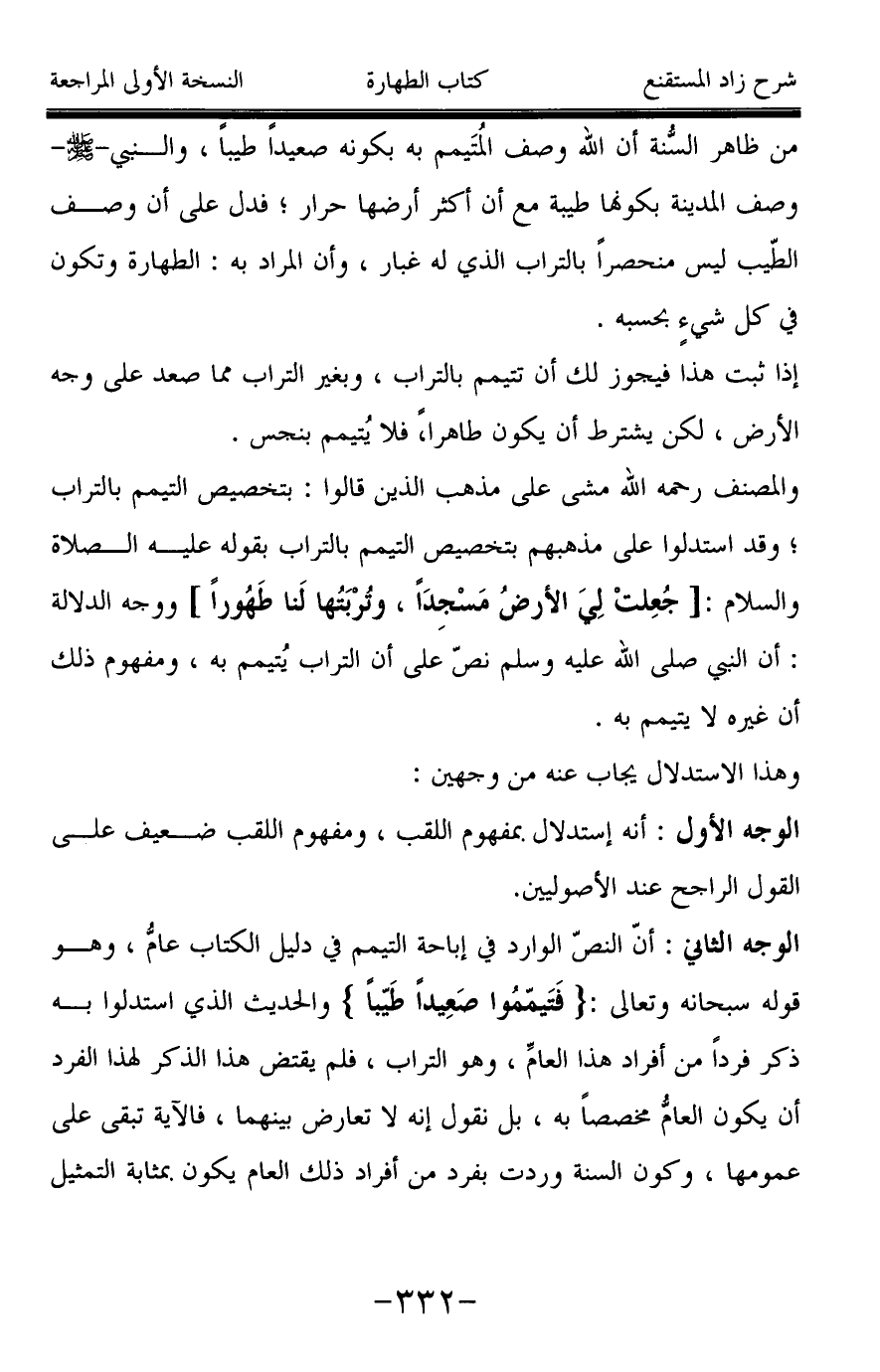 الوجه الثاني: أنّ النصّ الوارد في إباحة التيمم في دليل الكتاب عامُّ، وهو قوله سبحانه وتعالى: {فَتَيَمَّمُوا صَعِيدًا طَيِّبًا} والحديث الذي استدلوا به ذكر فرداً من أفراد هذا العامِّ، وهو التراب، فلم يقتض هذا الذكر لهذا الفرد أن يكون العامُّ مخصصاً به، بل نقول إنه لا تعارض بينهما، فالآية تبقى على عمومها، وكون السنة وردت بفرد من أفراد ذلك العام يكون بمثابة التمثيل