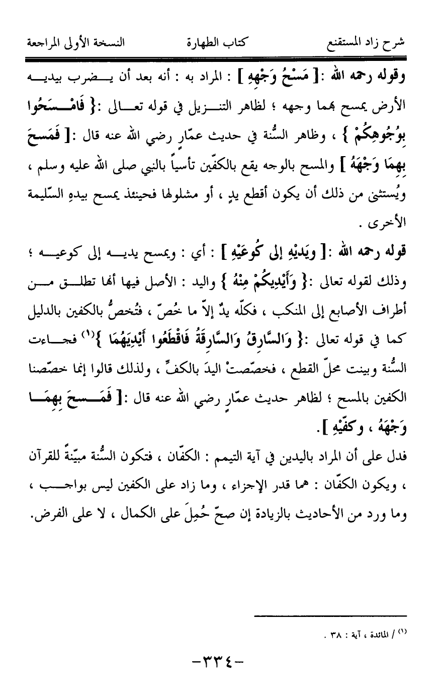 وقوله رحمه الله: [مَسْحُ وَجْهِهِ]: المراد به: أنه بعد أن يضرب بيديه الأرض يمسح بهما وجهه؛ لظاهر التنزيل في قوله تعالى: {فَامْسَحُوا بِوُجُوهِكُمْ}، وظاهر السُّنة في حديث عمّار رضي الله عنه قال: [فَمَسحَ بِهِمَا وَجْهَه] والمسح بالوجه يقع بالكفّين تأسياً بالنبي صَلَّى اللَّهُ عَلَيْهِ وَسَلَّمَ، ويُستثنى من ذلك أن يكون أقطع يد، أو مشلولها فحينئذ يمسح بيدهِ السّليمة الأخرى.