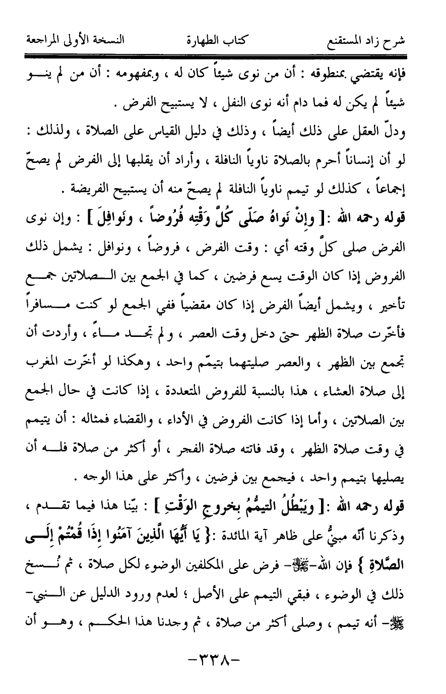 ودلّ العقل على ذلك أيضاً، وذلك في دليل القياس على الصلاة، ولذلك: لو أن إنساناً أحرم بالصلاة ناوياً النافلة، وأراد أن يقلبها إلى الفرض لم يصحّ إجماعاً، كذلك لو تيمم ناوياً النافلة لم يصحّ منه أن يستبيح الفريضة.