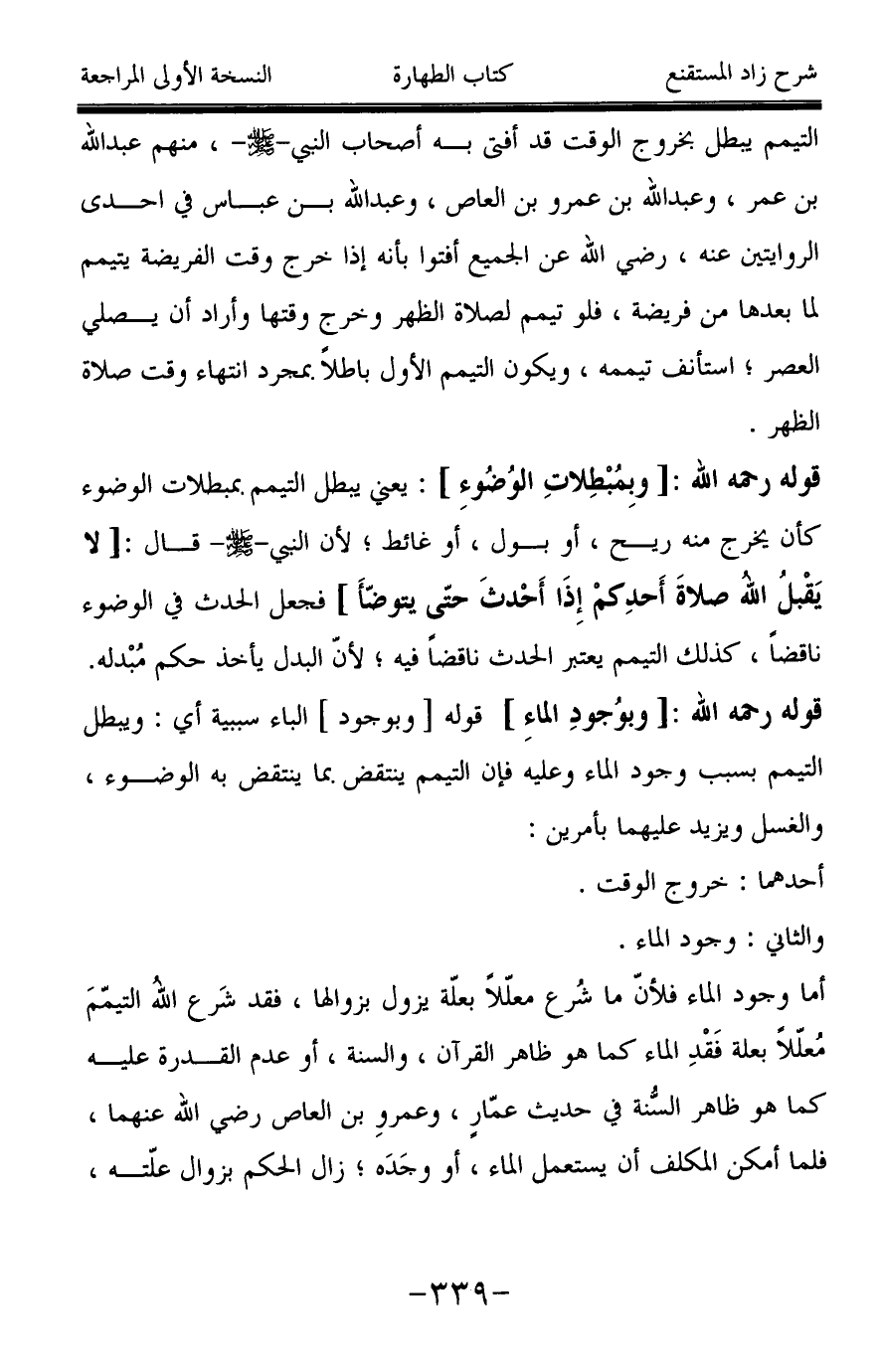 التيمم يبطل بخروج الوقت قد أفتى به أصحاب النبي -صَلَّى اللَّهُ عَلَيْهِ وَسَلَّمَ-، منهم عبد الله بن عمر، وعبد الله بن عمرو بن العاص، وعبد الله بن عباس في إحدى الروايتين عنه، رضي الله عن الجميع أفتوا بأنه إذا خرج وقت الفريضة يتيمم لما بعدها من فريضة، فلو تيمم لصلاة الظهر وخرج وقتها وأراد أن يصلي العصر؛ استأنف تيممه، ويكون التيمم الأول باطلاً بمجرد انتهاء وقت صلاة الظهر.