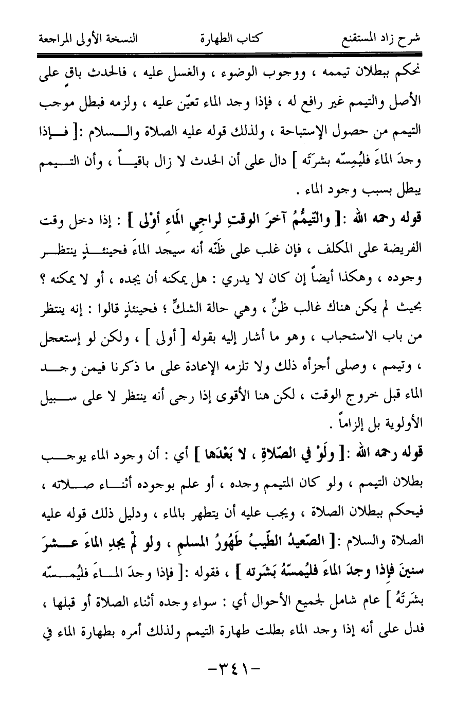 قوله رحمه الله: [والتّيمُّمُ آخرَ الوقتِ لراجِي الماءِ أوْلى]: إذا دخل وقت الفريضة على المكلف، فإن غلب على ظَنّه أنه سيجد الماءَ فحينئذٍ ينتظر وجوده، وهكذا أيضاً إن كان لا يدري: هل يمكنه أن يجده، أو لا يمكنه؟ بحيث لم يكن هناك غالب ظنِّ، وهي حالة الشكِّ؛ فحينئذٍ قالوا: إنه ينتظر من باب الاستحباب، وهو ما أشار إليه بقوله [أولى]، ولكن لو إستعجل، وتيمم، وصلى أجزأه ذلك ولا تلزمه الإعادة على ما ذكرنا فيمن وجد الماء قبل خروج الوقت، لكن هنا الأقوى إذا رجى أنه ينتظر لا على سبيل الأولوية بل إلزاماً.